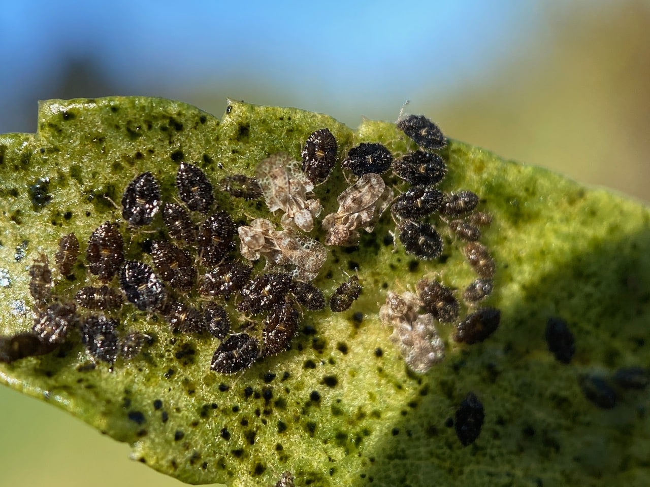 I found huge numbers of Lace Bugs, Corythucha sp.(family Tingidae), both adults and nymphs, on some sad looking Grindelia. The infected plants look sick, turn brown, and are covered with tiny spots of sooty mold growing on the puncture wounds inflicted by the sucking insects.
