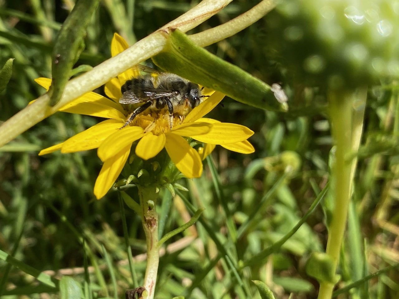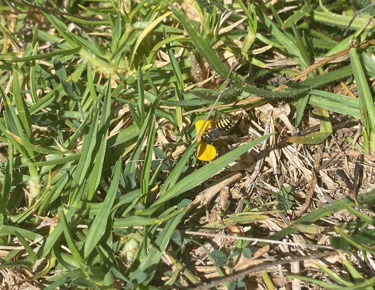 Most of extensive ground-cover of the Bird’s-foot Trefoil, Lotus tenuis have naturally died back. The flowers are much loved by the European Woolcarder Bees, Anthidium manicatum (family Megachilidae). I sadly watch as an individual keeps coming back to sip nectar from a single available flower. There is another flower species these bees resort to at this dire time of the year – the Bristly Oxtongue. I never see these small bees visit the Grindelia that is still abundant and in bloom here.