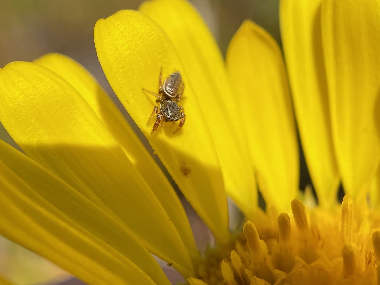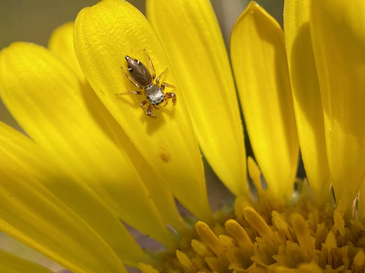 A tiny spider is moving around on the ray petals of a Grindelia flowerhead. It is a beautiful female Grapevine Jumping Spider, Sassacus vitis (family Salticidae).