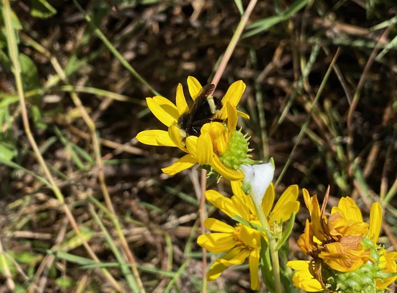 A male Western Leafcutter Bee, Megachile perihirta (family Megachilidae) checks on many Grindelia flowerheads before settling down on this one among the tangles of vegetation. He seems to be getting ready for a nap.