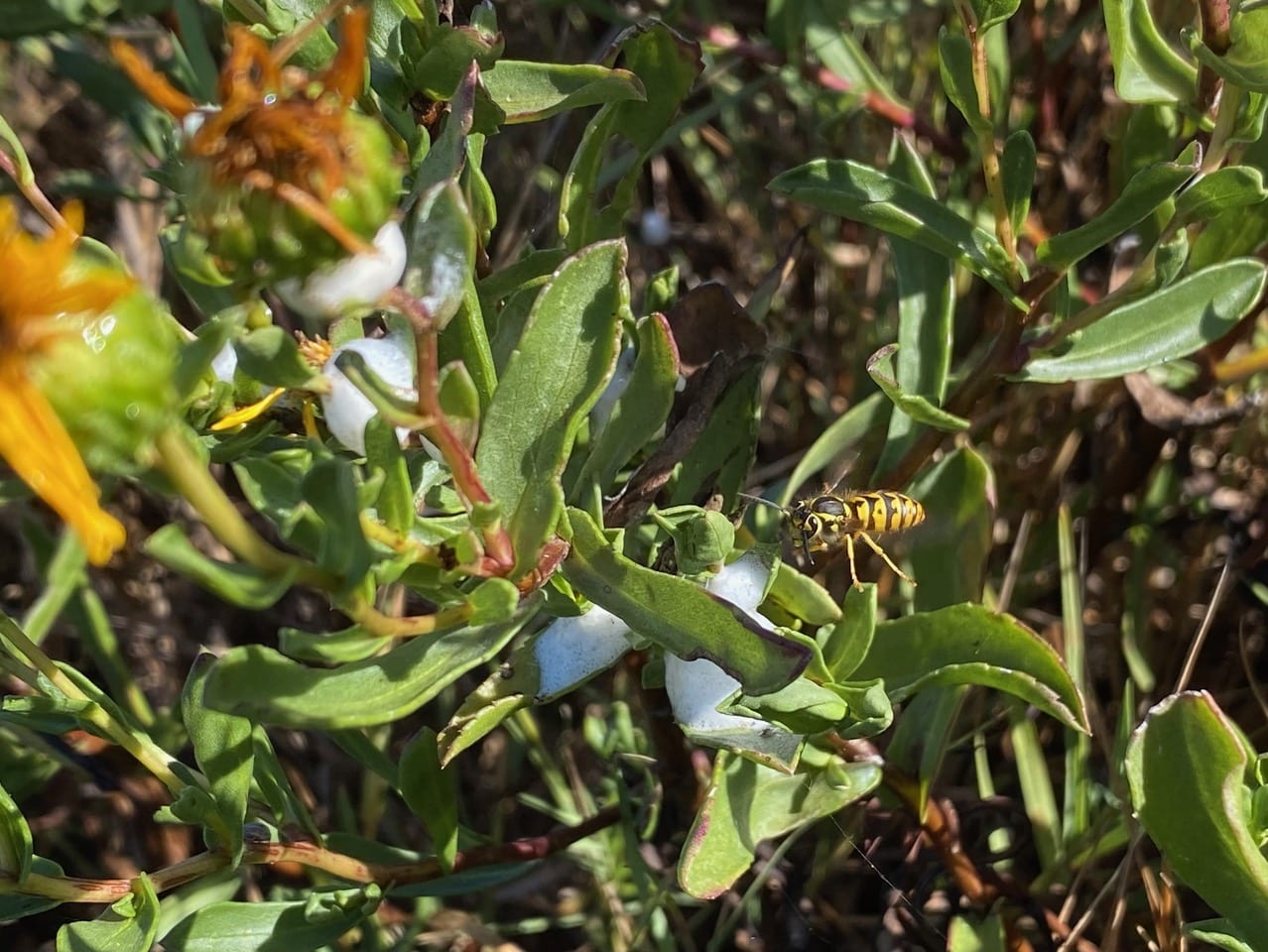 A Yellowjacket is patrolling the foamy masses on the Oregon Gumweed, Grindelia stricta. Is it hunting for Spittlebugs?