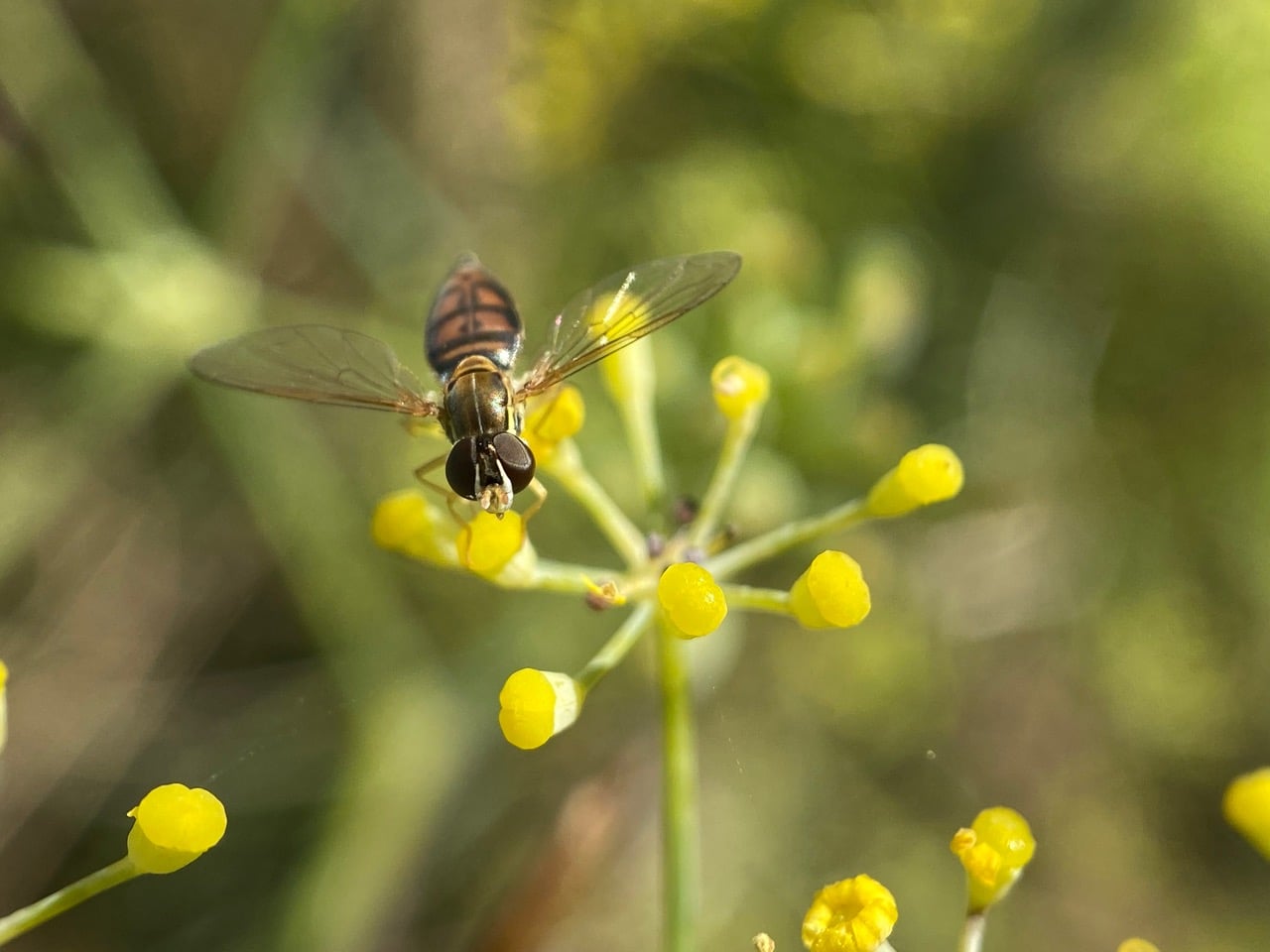 A Margined Calligrapher, Toxomerus marginatus (family Syrphidae) is foraging on the succulent style base of a Fennel flower. Do these flowers still produce nectar after they have shed their petals?