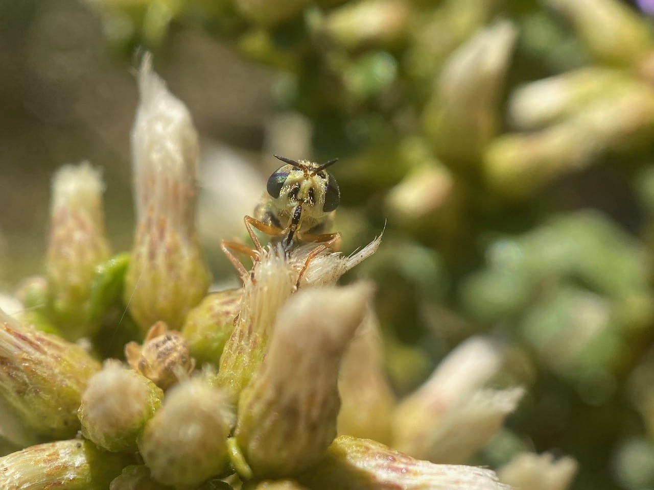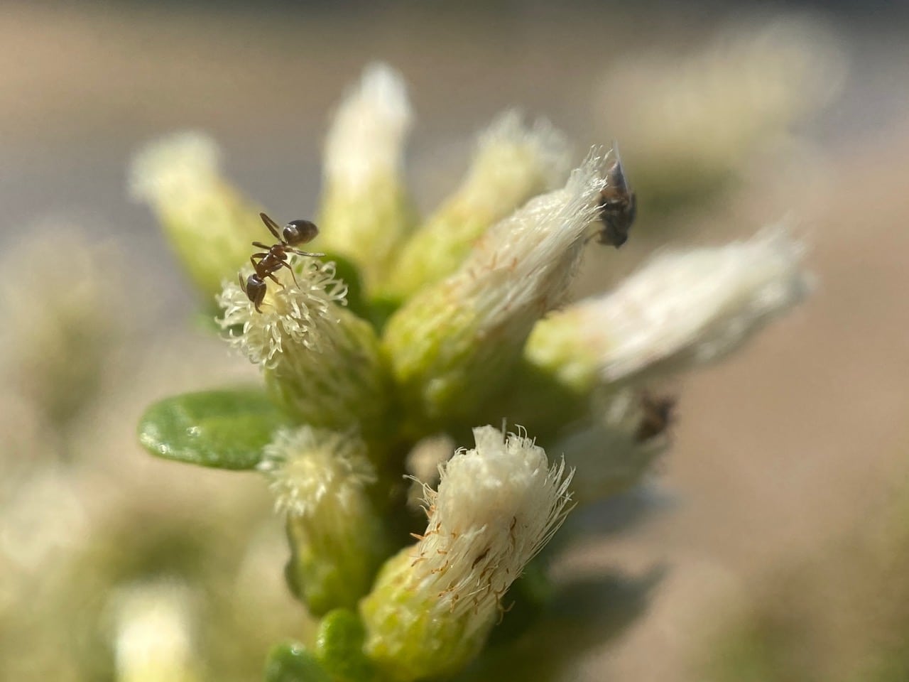 Perched atop a freshly blooming flowerhead of the Coyote Brush, an Argentine Ant, among other small creatures, is taking nectar.