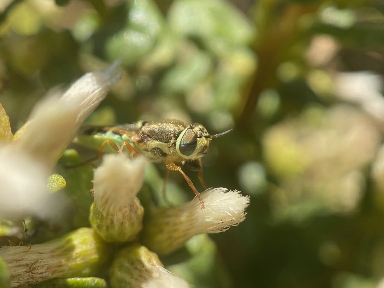 Its proboscis extended, the Soldier Fly is taking nectar from a flowerhead of the female Coyote Brush.