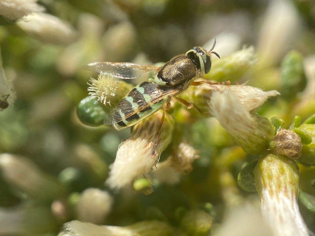 I never fail to find a Soldier Fly, Odontomyia sp. (family Stratiomyidae) on this female Coyote Brush, Baccharis pilularis. This individual is different from the others I have seen – it has a green striped abdomen!