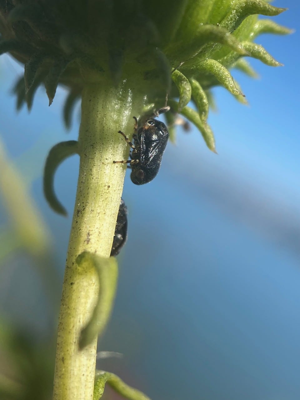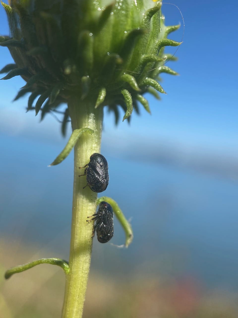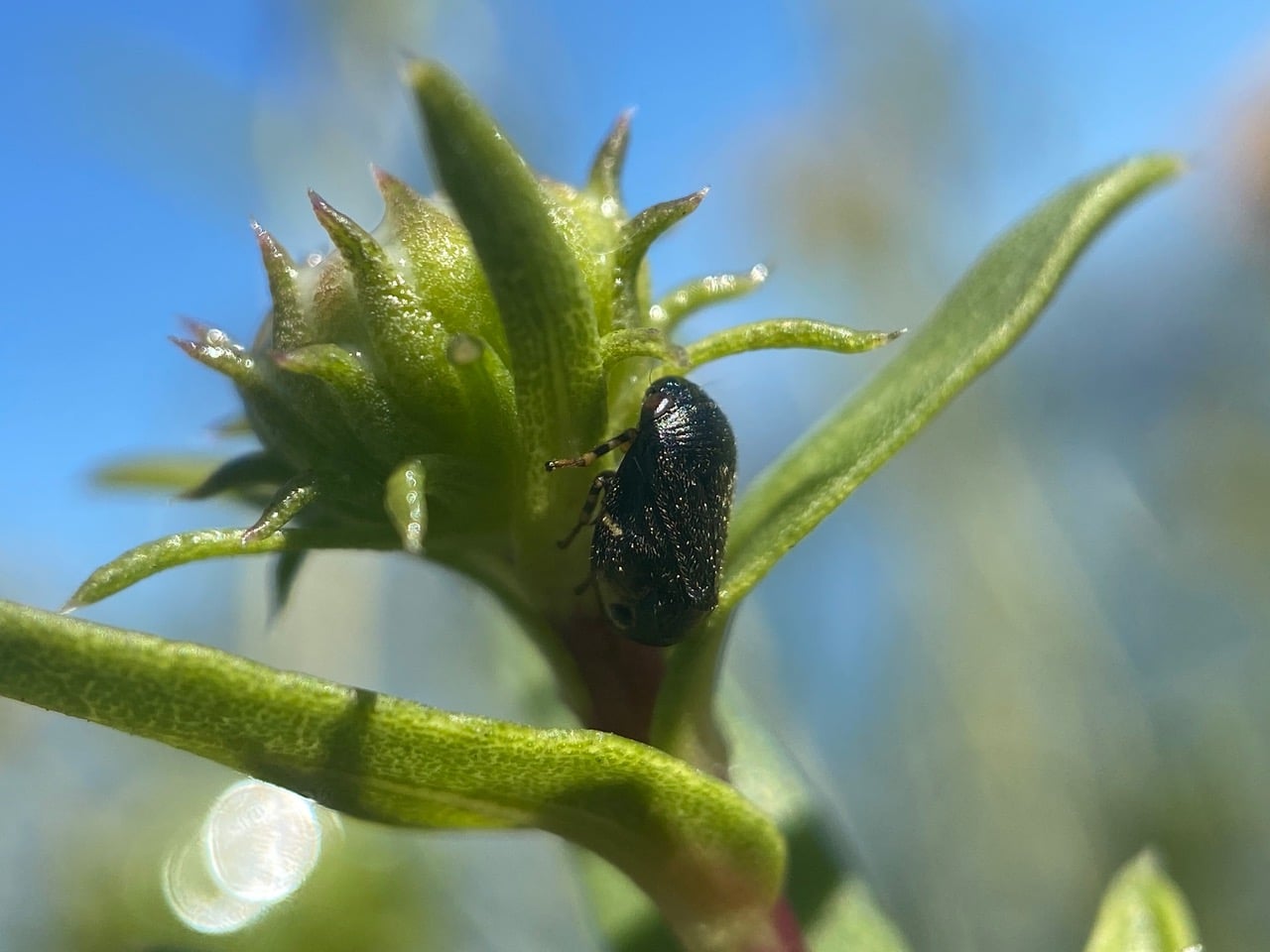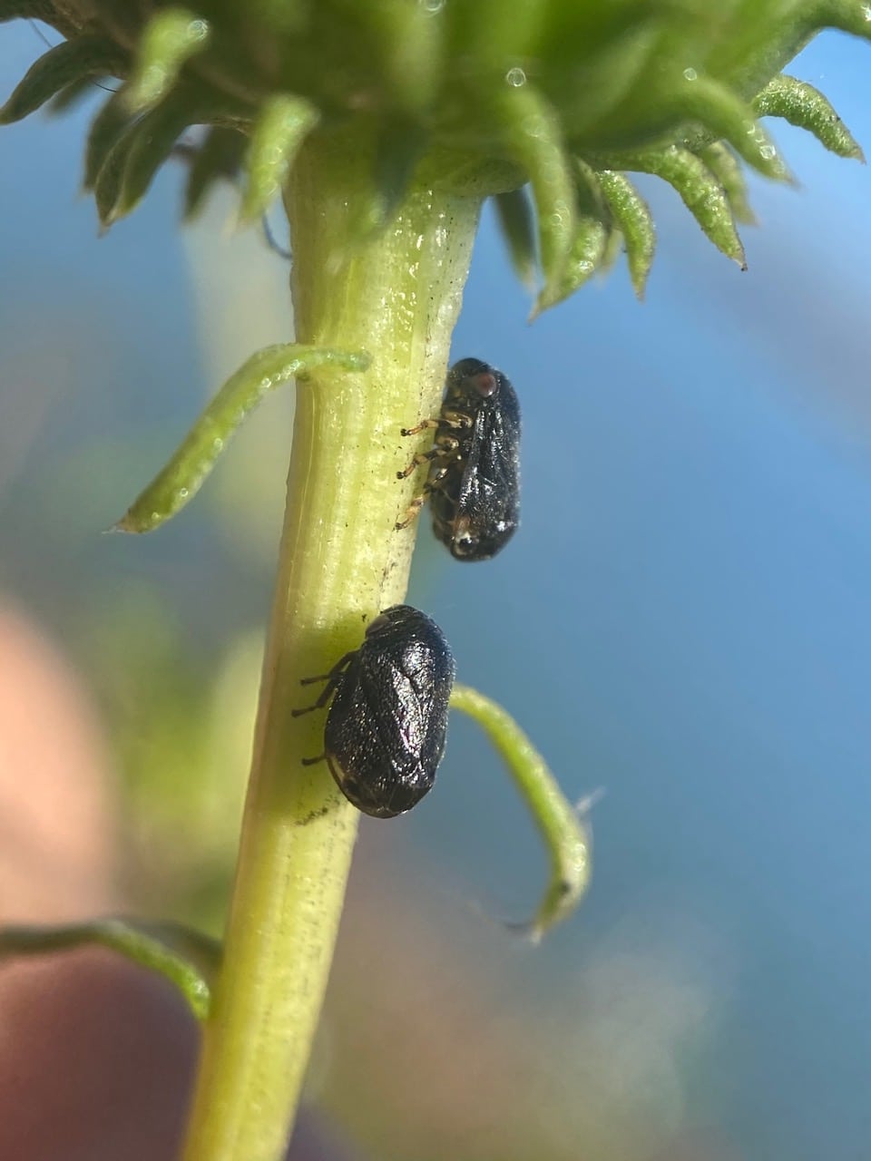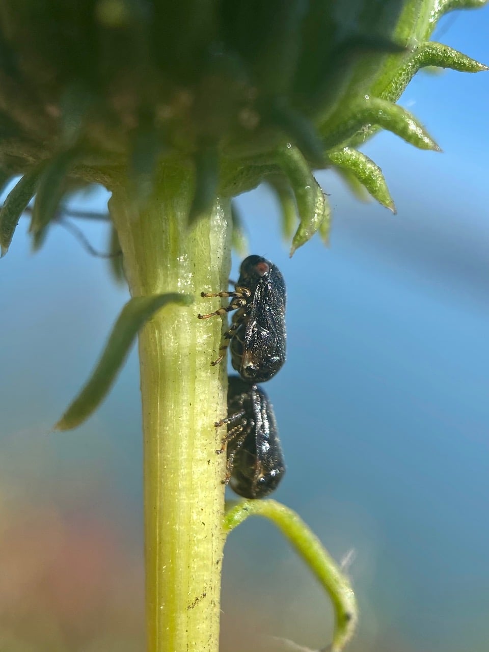 Wait, there are two black Spittlebugs close to each other under a Grindelia flowerhead. I stop to watch if they were interacting.