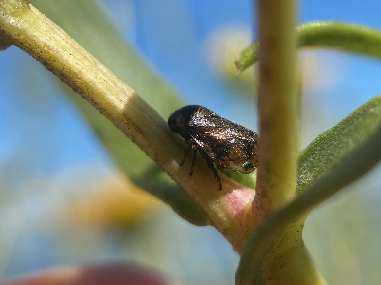 A dark brown Spittlebug, Complex Clastoptera lineatocollis (family Clastopteridae) is resting at a Grindelia leaf axil.