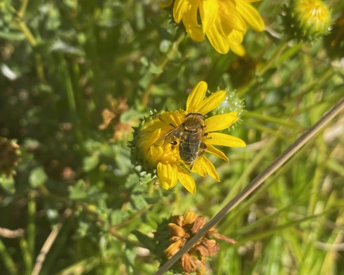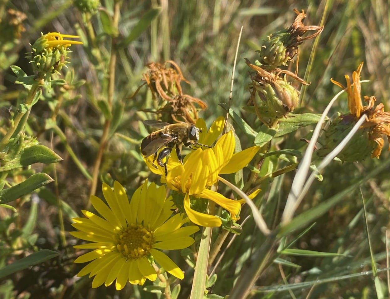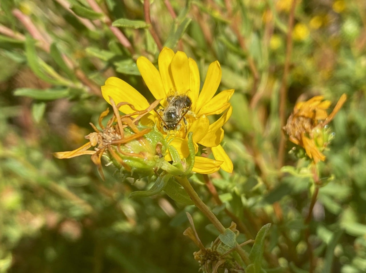 There are a few Summer Longhorn Bees, Melissodes sp. (family Apidae), both males and females out foraging on the Grindelia, but their numbers have dwindled markedly. Their season is inevitably coming to an end.