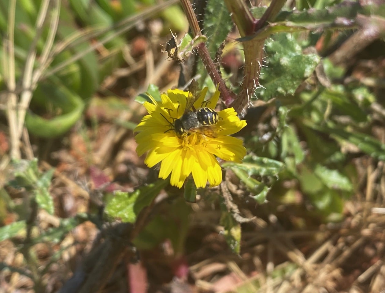 A European Woolcarder Bee, Anthidium manicatum (family Megachilidae) is foraging on a flowerhead of the Bristly Oxtongue, Picris echioides.