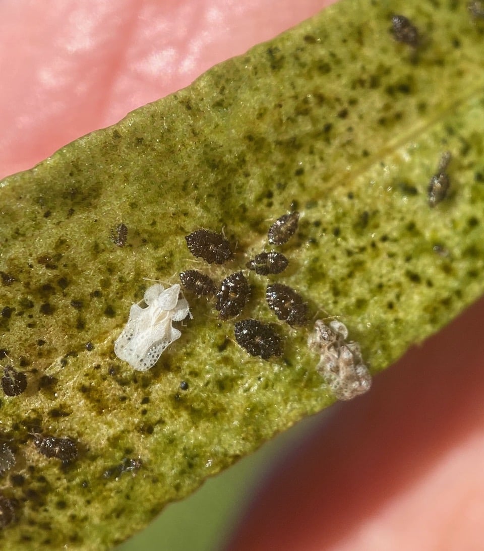 The Tingidae are a family of very small (2-10 mm) insects in the order Hemiptera that are commonly referred to as lace bugs. They are called lace bugs because the pronotum and fore wings of the adult have a delicate and intricate network of divided areas that resemble lace. Their body is flattened dorsoventrally, and the head is often concealed under the hood-like pronotum. Lace Bugs feed by sucking sap from plants, extracting the protein they need and excreting liquid waste as honeydew. The most common symptom of feeding is the stippled and mottled yellowish foliage. In heavy infestations, black sooty mold may develop on the honeydew, impairing photosynthesis by the plant. This may result in some dieback of twigs and branches and a reduction in flowering the following year. Tingids are usually host-specific and can be very destructive to plants. Each individual usually completes its entire lifecycle on the same plant, if not the same part of the plant.
