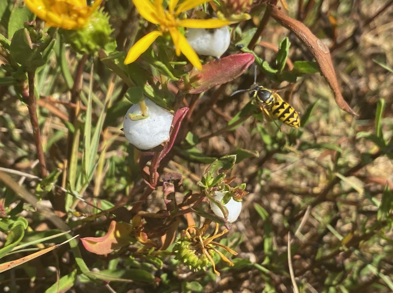 When I return about 20 minutes later, I spot a Yellowjacket perched lower down the stem, busy chewing on something. It flies away before I can get a photo. I immediately look for the two Spittlebugs – they are nowhere to be found! The scenario that comes to mind is that the Yellowjacket has nabbed the mating pair. Alternatively, maybe the Yellowjacket got one of them, and the other jumped off. If the spittlebug is considered a pest harming the Grindelia, then the Yellowjacket is certainly providing a service as a natural pest control agent. It takes me a while to come to terms with that thought as I walk away, shaken. Real or imagined, predation is not pretty.