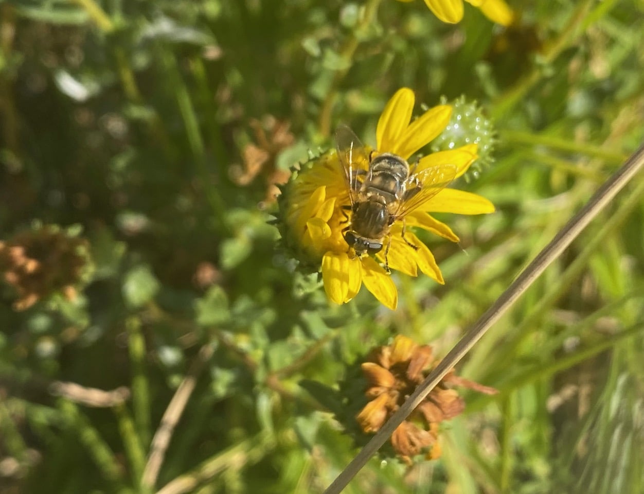 Everyday when I walk this short stretch of Shoreline Park, I often see this large brown hoverfly foraging on the Grindelia flowers. I am lucky to get some pictures of the elusive creature this morning.