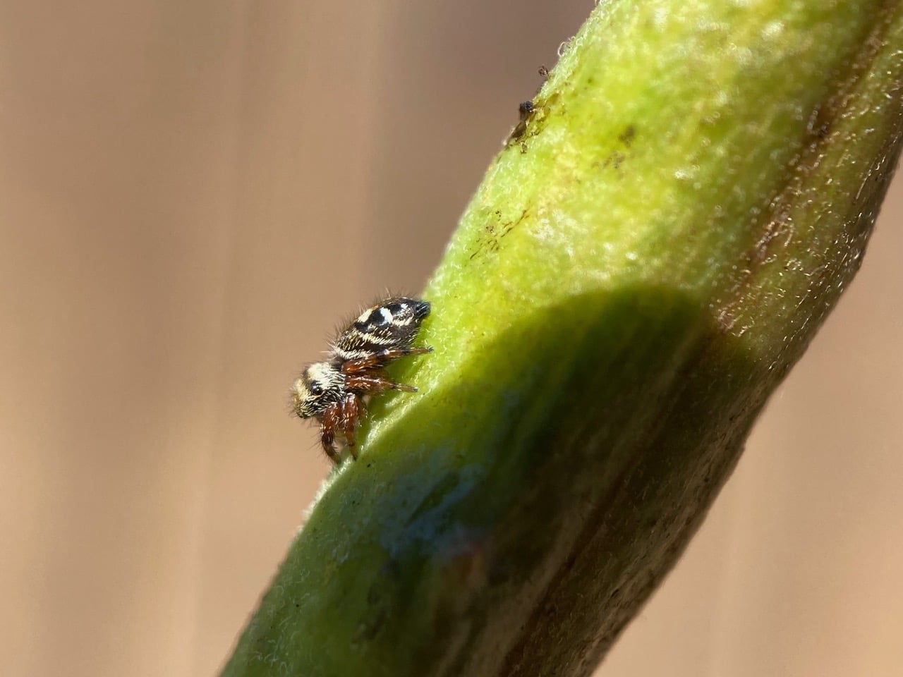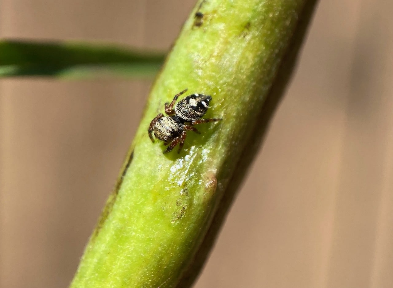 A small Jumping Spider is running on an immature milkweed seed pod. iNaturalist has helped identify it as a Bold Jumping Spider, Phidippus audax (family Salticidae).