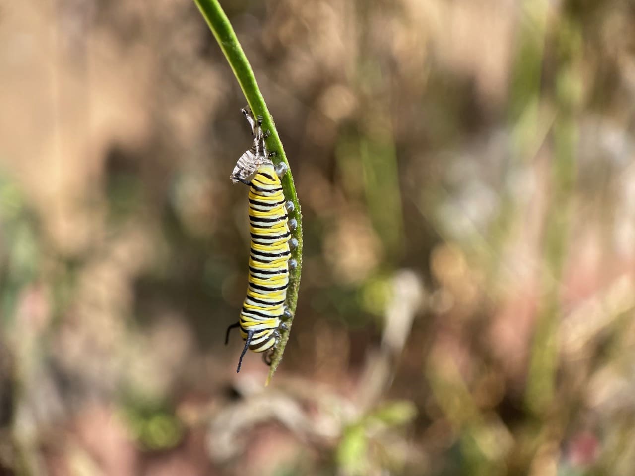 Hey, there’s a small Monarch caterpillar at the end of that drooping milkweed leaf!