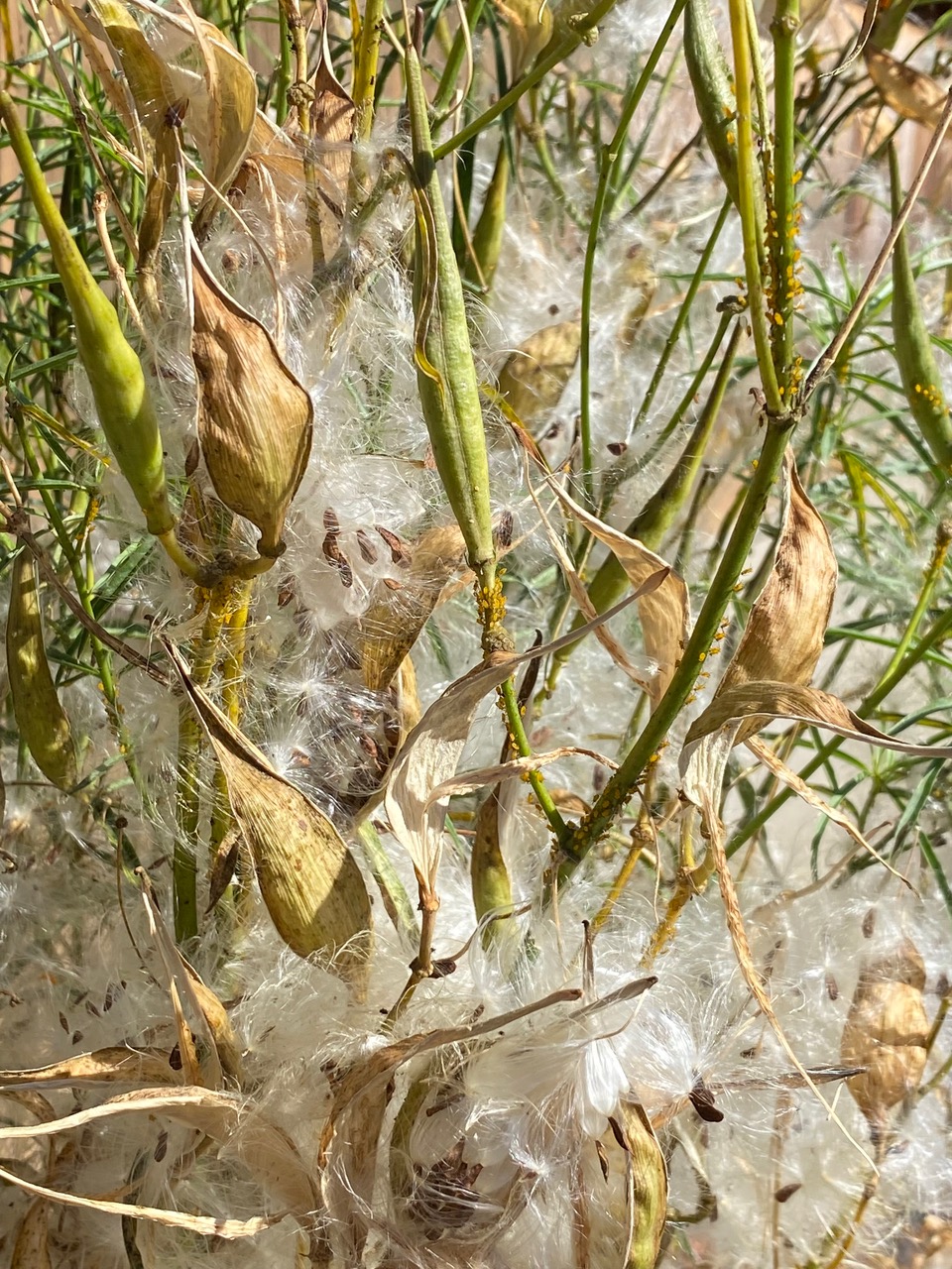 The Narrowleaf Milkweed, Asclepias fascicularis in the backyard has exploded into a riot of silky plumed seeds.
