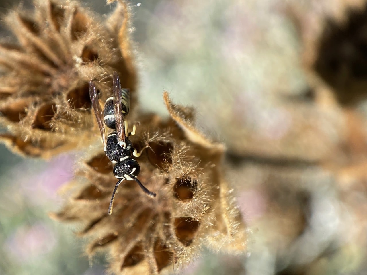 A small wasp is hunting on a seed head of a Palmer’s Indian Mallow, Abutilon palmeri in the corner of the front yard. It is a Mason Wasp, Ancistrocerus bustamente (family Vespidae, subfamily Eumeninae).