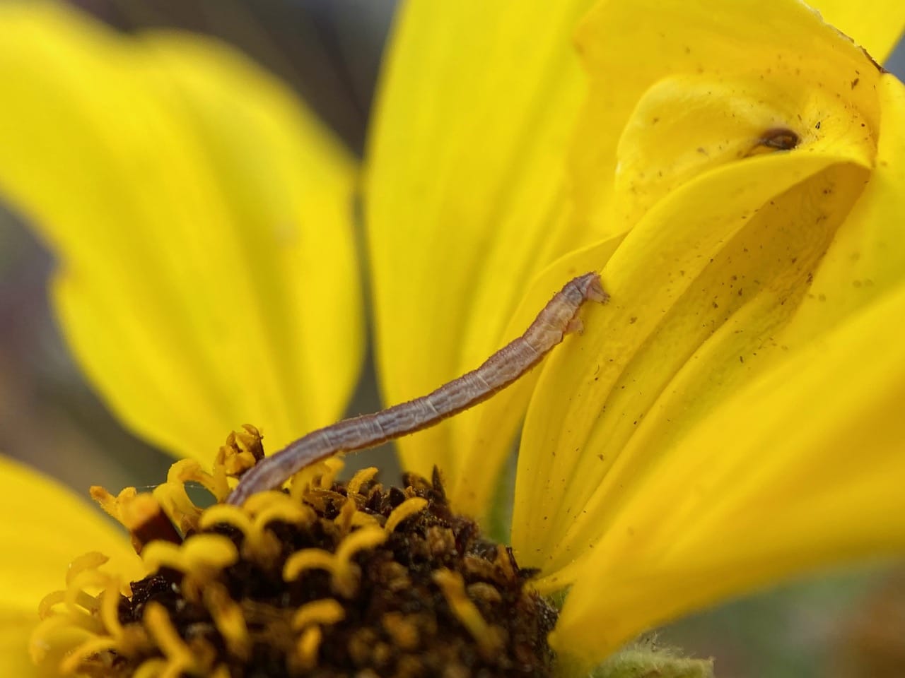 Its anal prolegs firmly anchored on a ray petal of a Bush Sunflower flowerhead, an inchworm has buried its head to feed on the florets in the center. It is the caterpillar of the Pug Moth, Eupithecia sp. (family Geometridae).