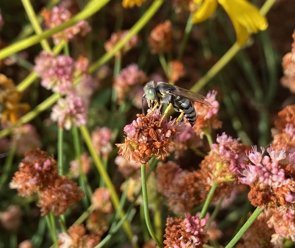 The clouds have cleared early this morning and there should be insects flying. I decide to revisit Jenny and Craig’s predominantly native garden in Alameda. Although it is a young garden installed in 2024, I have been impressed by the diversity of insects on their well chosen plants the last time I visited.