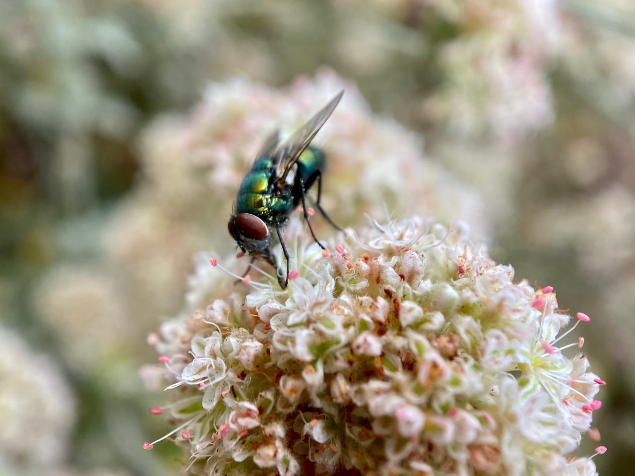 A Common European Greenbottle Fly, Lucilia sericata (family Calliphoridae) is foraging on the flowers of a white-flowered Buckwheat in the front yard.
