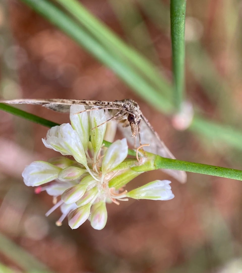 Flushed up by my footfall, a small brown moth lands upside down on the stem of Buckwheat. It lifts off again when I approach for a better photo…