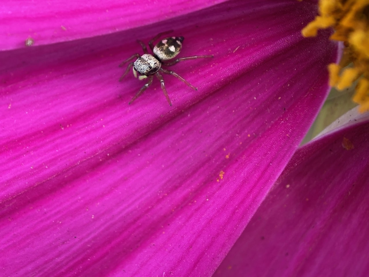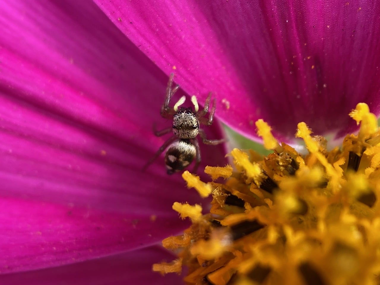 A Sun Jumping Spider, Heliophanus apiatus (family Salticidae) is hunting on a Cosmos flowerhead in front of the house.