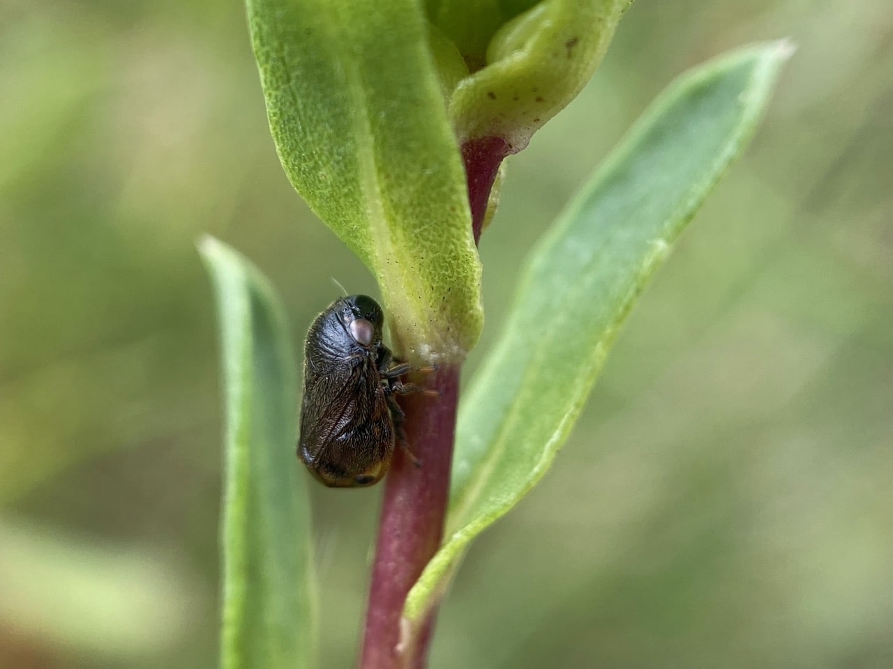 A black adult Spittlebug, Complex Clastoptera lineatocollis (family Clastopteridae) is resting on the stem of a Grindelia. I am puzzled by the color variations I have been seeing. iNaturalist has identified both the brown and the black individuals as the same species. Are the colors of the adults age-related? Is the species sexually dimorphic? The best way to find out is to find a mating pair.
