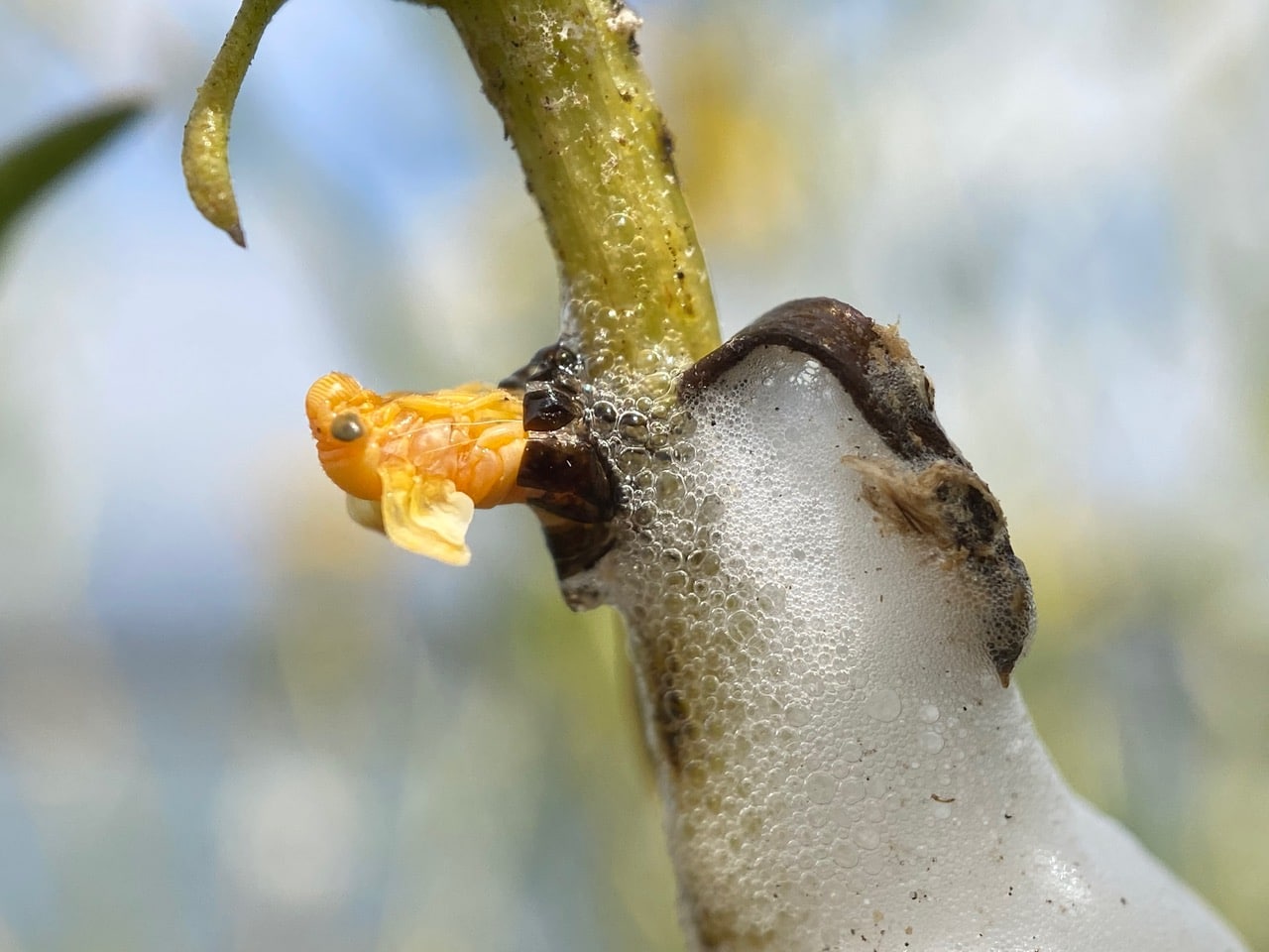 The Froghoppers (superfamily Cercopoidea) are a group of “true bugs” in the order Hemiptera. Adults are capable of jumping many times their height and length, giving them their common name, but many species are best known for their plant-sucking nymphs which produce foam shelters, and are referred to as “spittlebugs”. The superfamily currently consists of three families: the Aphrophoridae, Cercopidae, and Clastopteridae. The nymphs produce a cover of foamed-up plant sap visually resembling saliva, hence the common name. Whereas most insects that feed on plant sap tap into the nutrient-rich fluid from the phloem, the spittlebugs utilize the much more dilute sap flowing upward from the roots via the xylem. The insects’ digestive system contains symbiotic bacteria that provide them with the essential amino acids. The large amount of excess water that must be excreted and the evolution of special breathing tubes allow the young spittlebug nymphs to grow in the relatively protective environment of their foam shelters. The foam serves a number of purposes. It hides the nymph from the view of predators and parasites, and it insulates against heat and cold, providing thermal as well as moisture control. It also has an acrid taste that deters predators.
