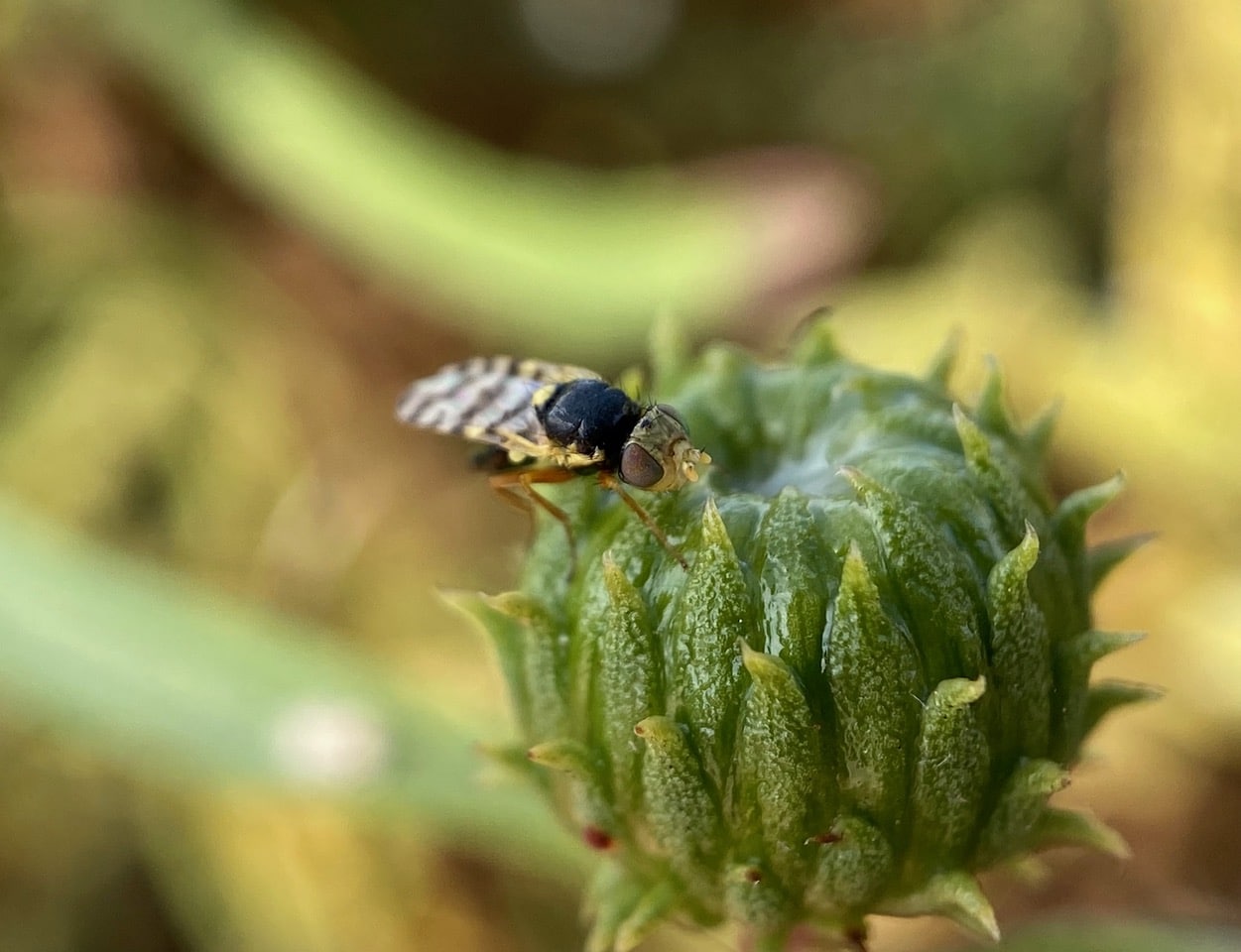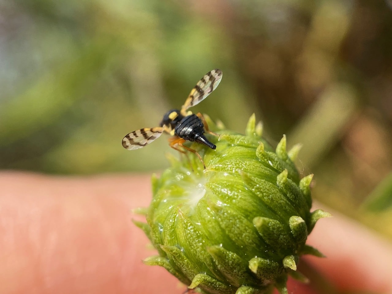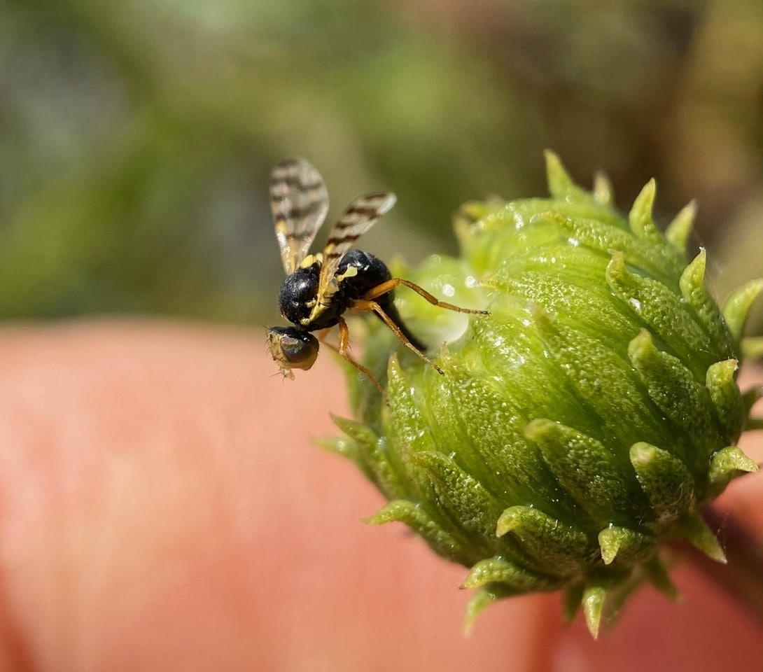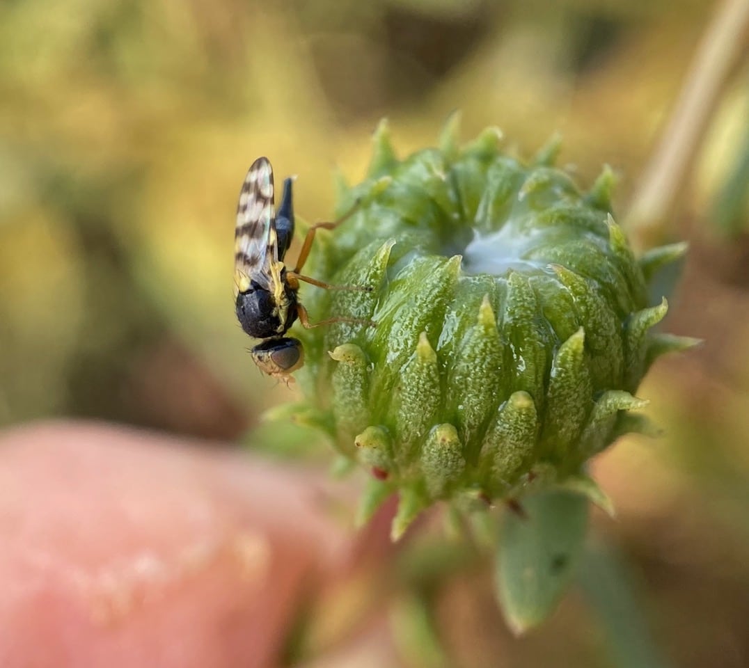 Stopping to take a look at a small insect on an immature Grindelia flowerhead through the macro lens, I recognize it as a Fruit Fly (family Tephritidae), although not a familiar species. It is a female with a pointed oviscape on the tip of her abdomen. The oviscape is the protective structure through which the female’s telescopic ovipositor is extended when laying eggs.