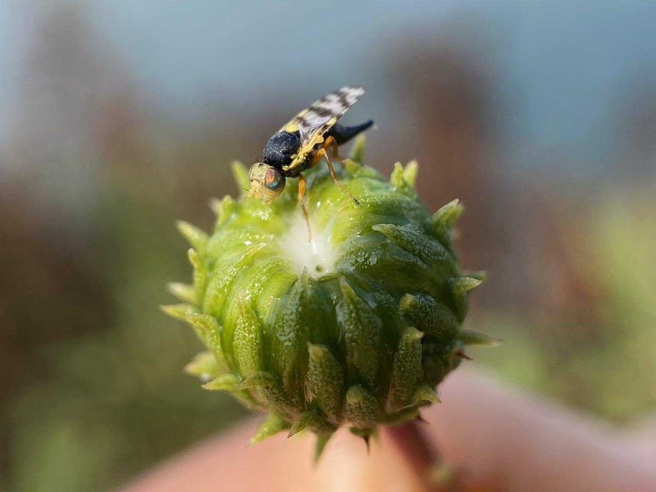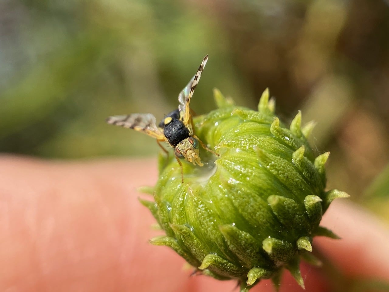 The fly lowers her mouthparts as if testing the gooey white sap at the center of the immature flowerhead.