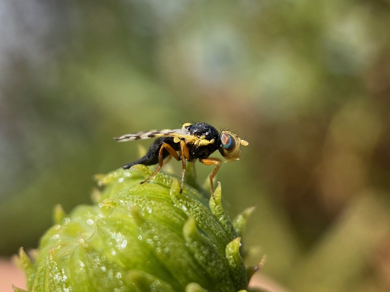 Commonly called Fruit Flies, Tephritids are small to medium-sized flies that are often colorful, and usually with picture wings. The larvae of almost all Tephritidae are phytophagous. Females deposit eggs in living, healthy plant tissues using their telescopic ovipositors. Here the larvae find their food upon emerging. The larvae develop in leaves, stems, flowers, seeds, fruits, and roots of the host plant, depending on the species. Adults are often found on the host plant and feeding on pollen, nectar, rotting plant debris, or honeydew. Tephritid flies are of major economic importance as they can cause damage to fruit and other plant crops. On the other hand, some Tephritids are used as agents of biological control of noxious weeds.