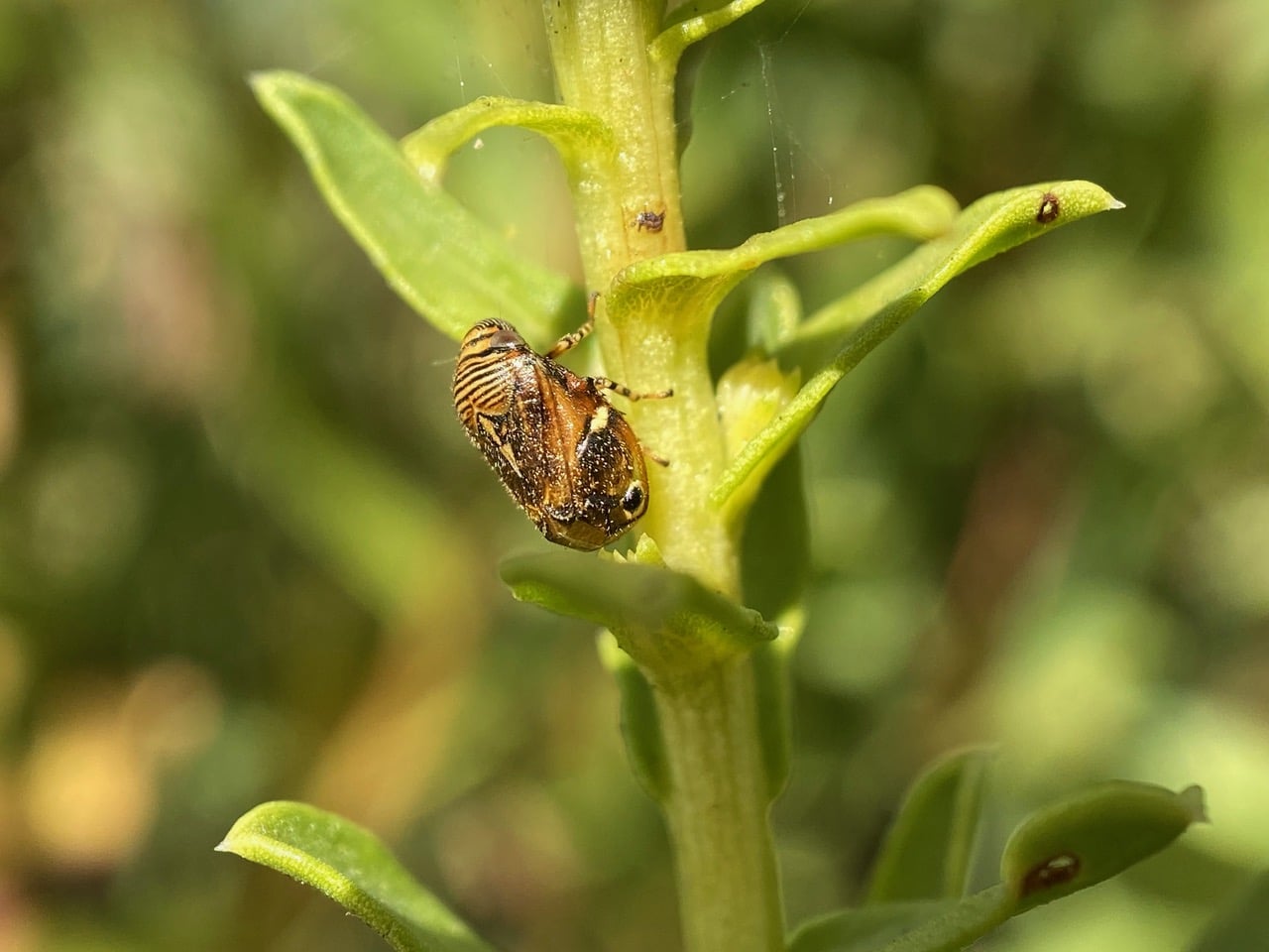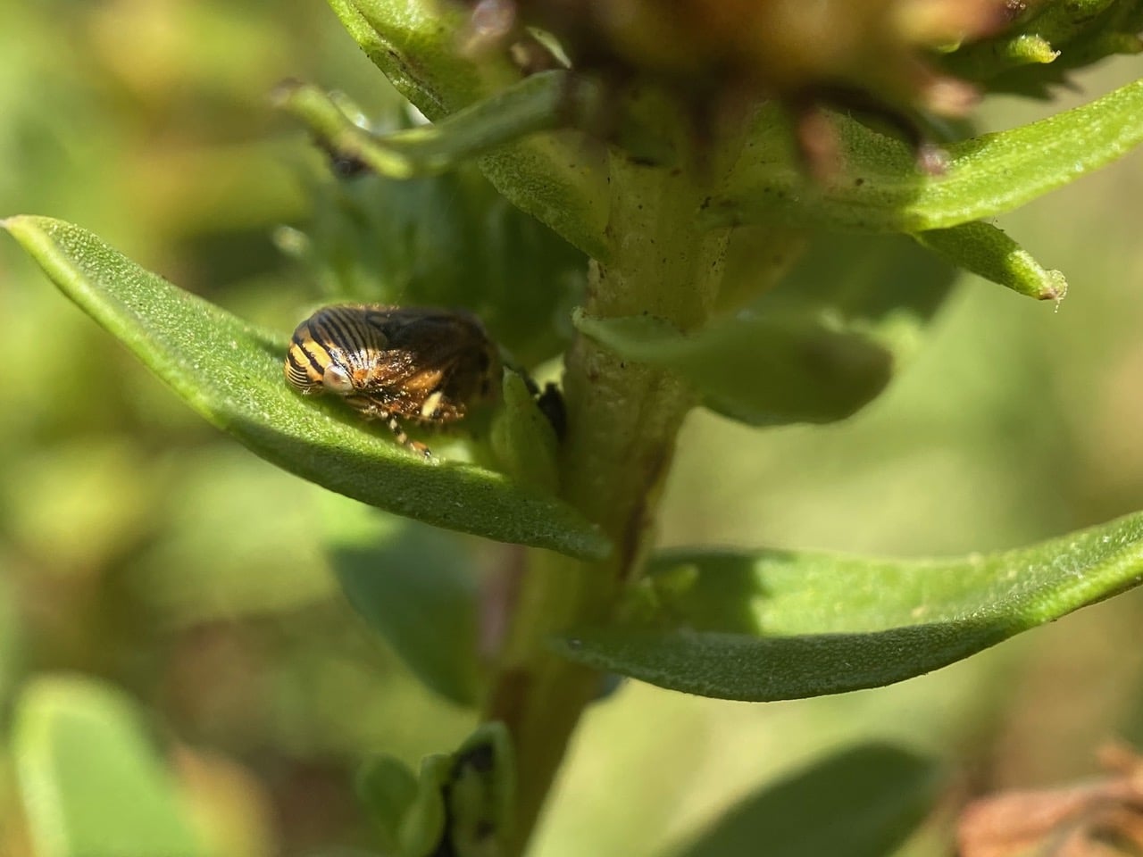 I check the Grindelia plant on which I have observed a Spittlebug, Complex Clastoptera lineatocollis (family Clastopteridae) make its debut as an adult yesterday. This is the first adult I found on the plant, just like yesterday – it seems these bugs are very sedentary. This bug has only moved a couple of inches down from its position yesterday.
