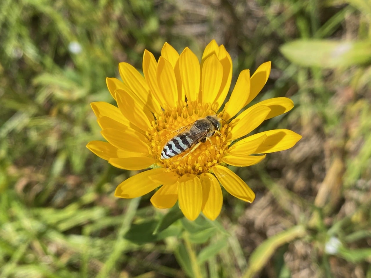An American Sand Wasp, Bembix americana (family Crabronidae) is taking nectar from a Grindelia flowerhead.