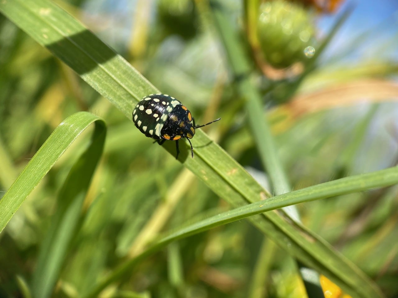 A colorful third instar nymph of the Southern Green Stinkbug, Nezara viridula (family Pentatomidae) is resting on a blade of grass. Why does an insect that is all green as an adult have nymphal stages that are whimsically patterned and colored? Mother Nature certainly has a sense of humor! So far I have seen quite a few of the nymphs, but none of the adults. The latter, being green, must be much harder to spot.