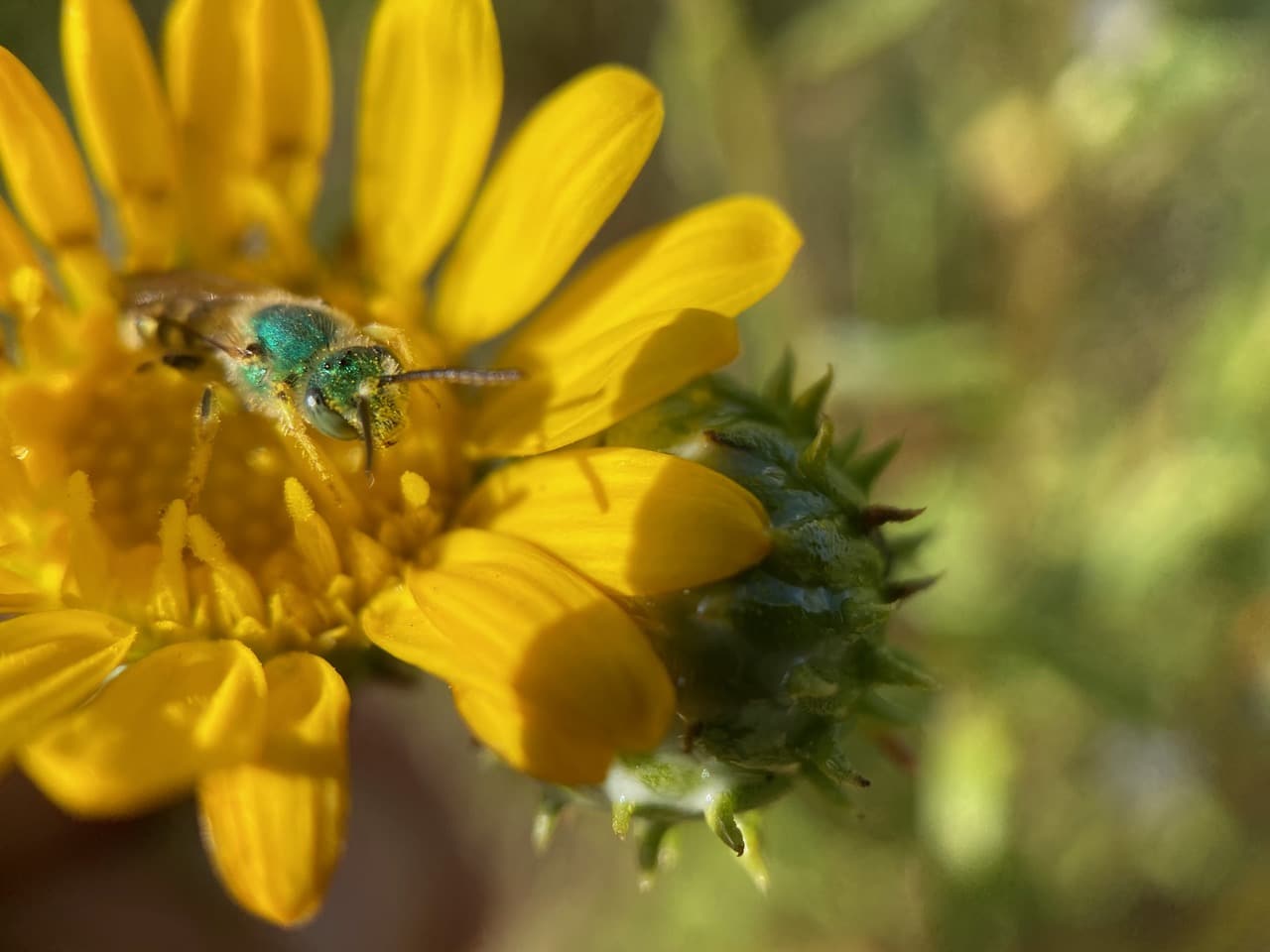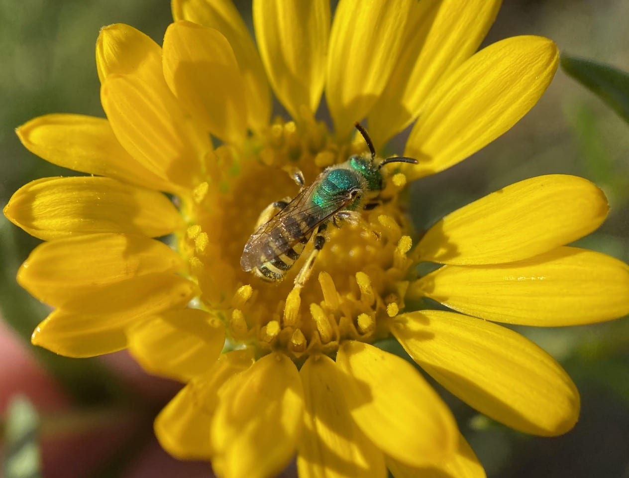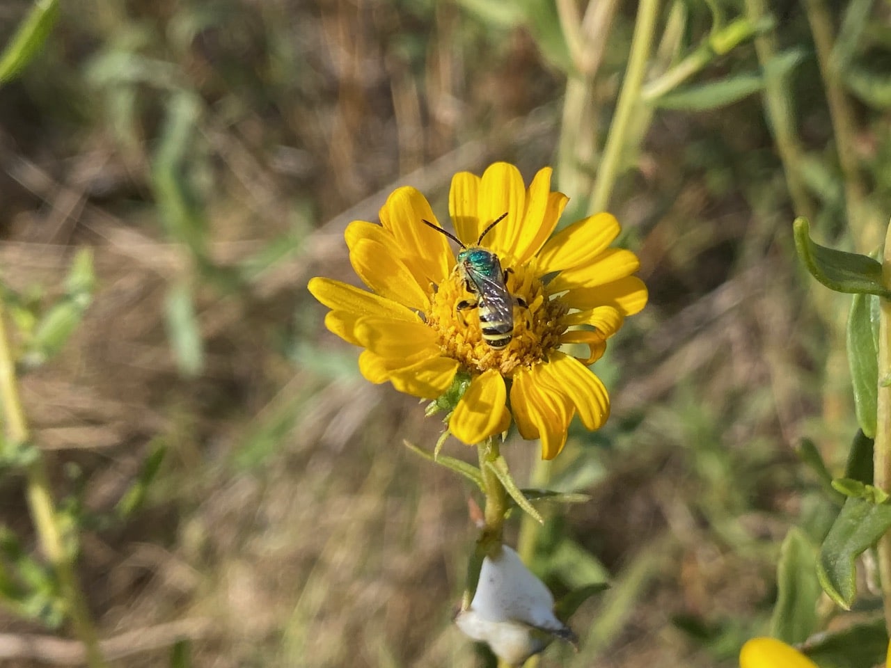A male Texas Striped Sweat Bee, Agapostemon texanus (family Halictidae) is foraging on a Grindelia flowerhead.