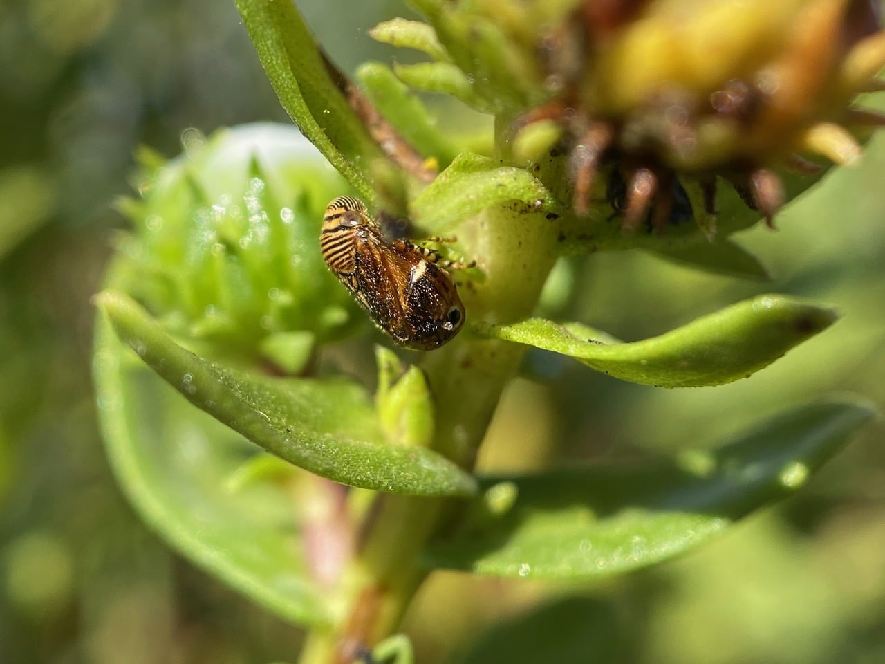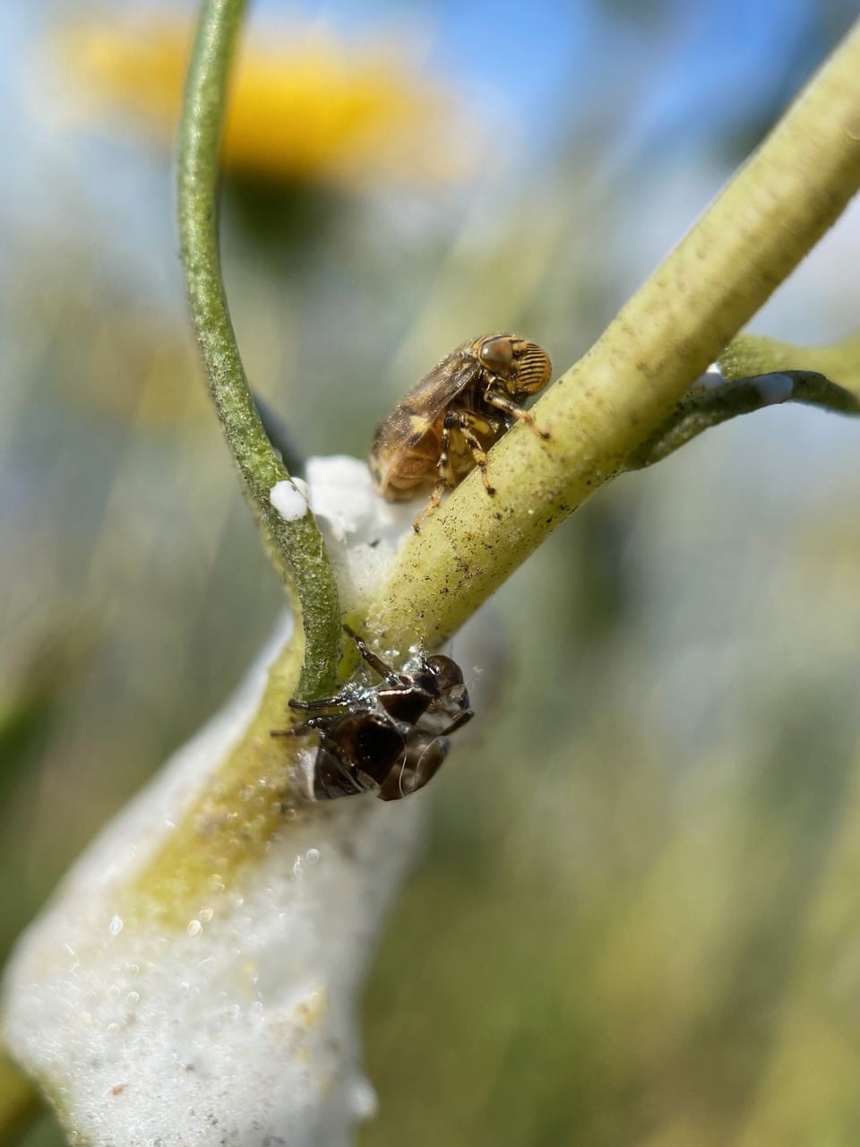 I hurry to the Grindelia plant on which I have found six emerging adult Spittlebugs yesterday. When I left them at around 2:30 pm yesterday they were still pale tenerals. I expect them to be full-fledged adults with their final coloration by now. Sure enough I don’t see any tenerals on the plant today. I find only two adults – this brown one above its foam shelter and exuvia….