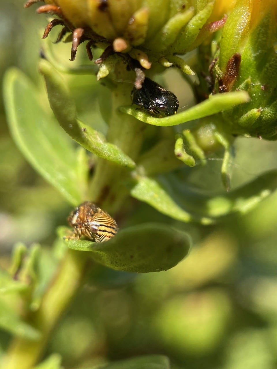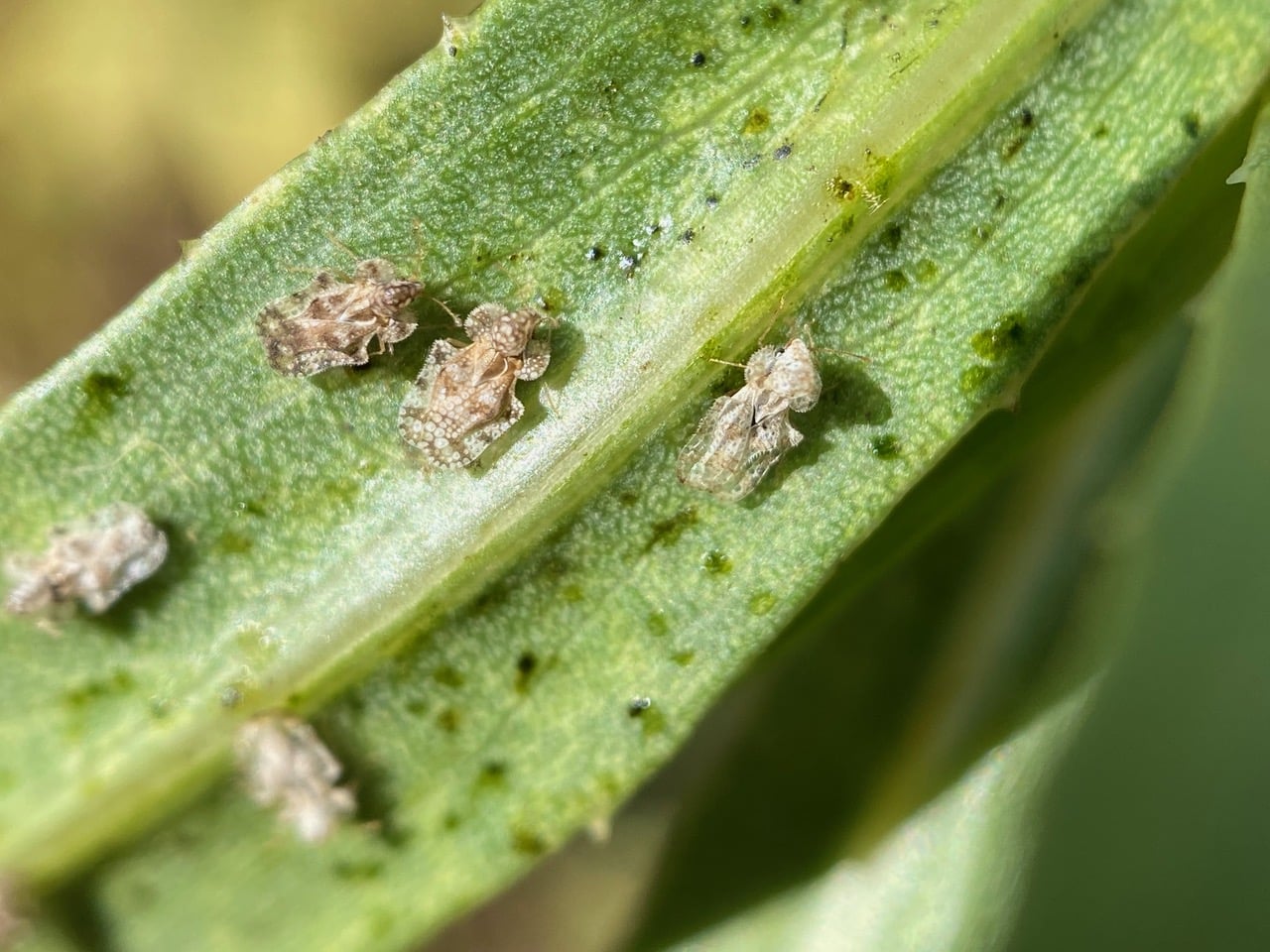 Wow, that Grindelia is in trouble! Its leaves are speckled with Sooty Mold and turning yellow. You can actually see the culprits – the tiny Lace Bugs (family Tingidae) and their black nymphs on the leaves.