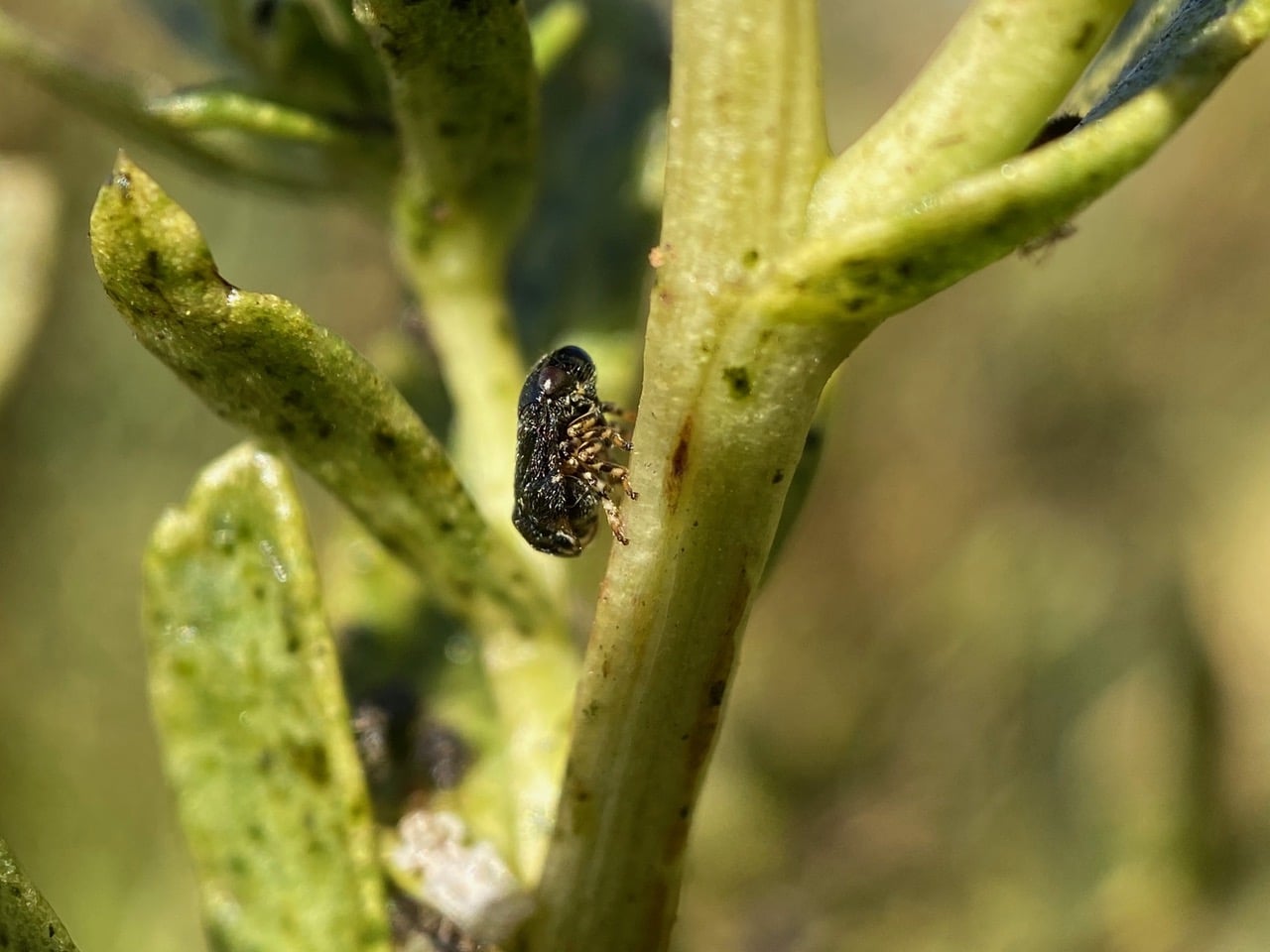 After crawling a bit, the Spittlebug settles down on a leaf. In trying to photograph it, I spot a black individual on another leaf above it. The black one is quite a bit smaller. I wonder if the two will interact?