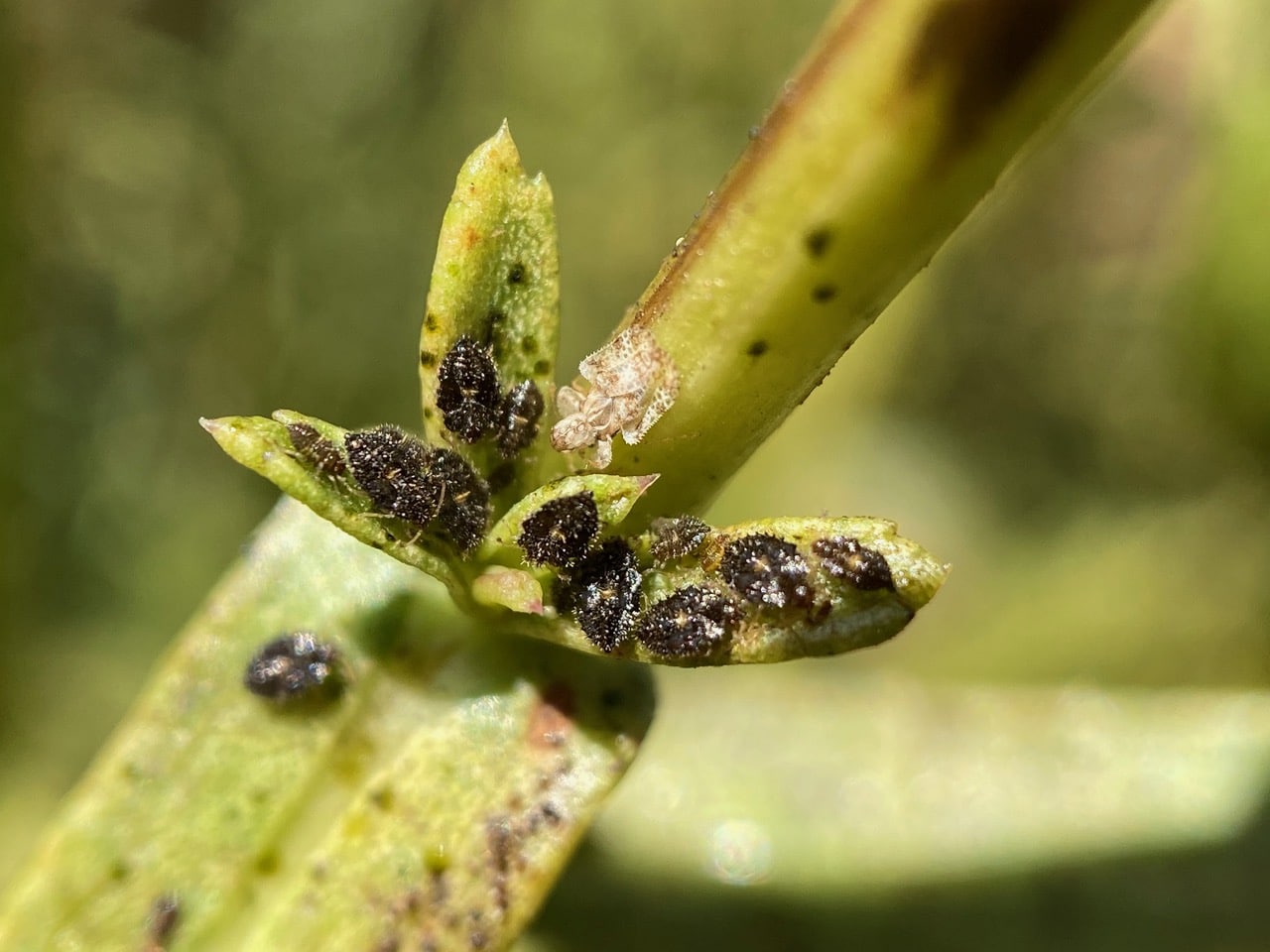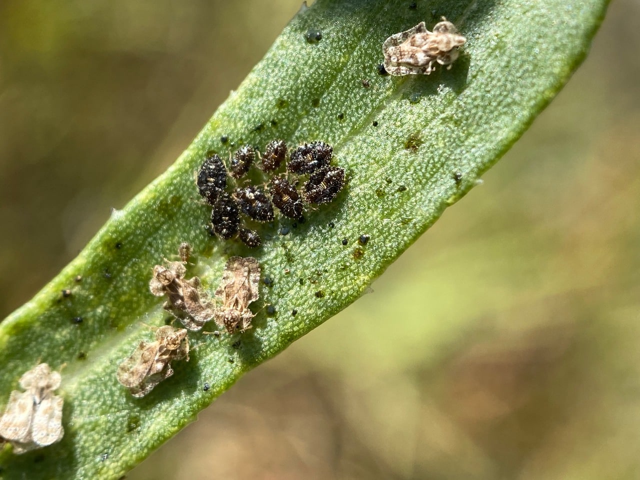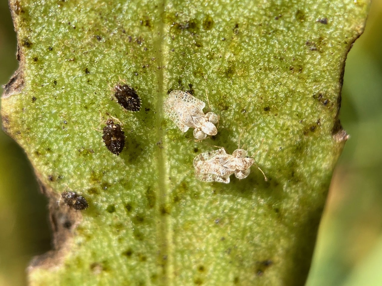 A few adult Lace Bugs, Corythucha sp. (family Tingidae) next to a cluster of shiny black nymphs. Note that the leaf is speckled with black Sooty Mold that grows on the sugary honeydew excreted by the bugs.