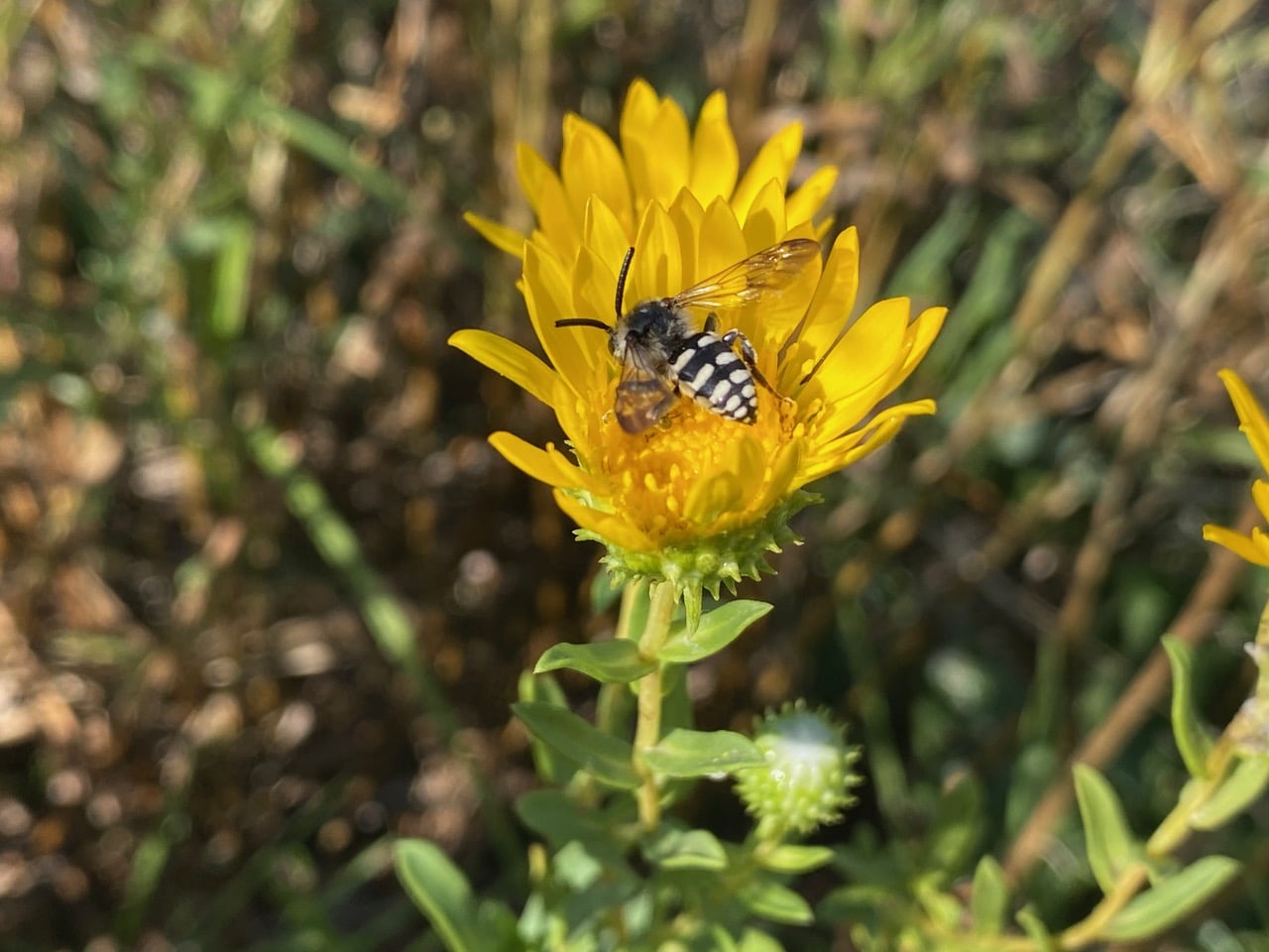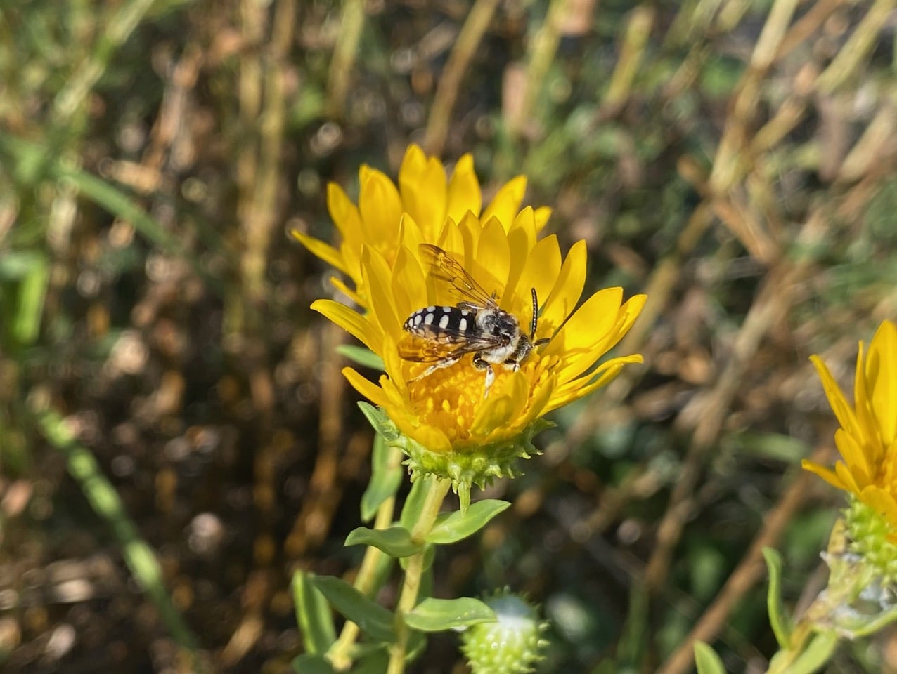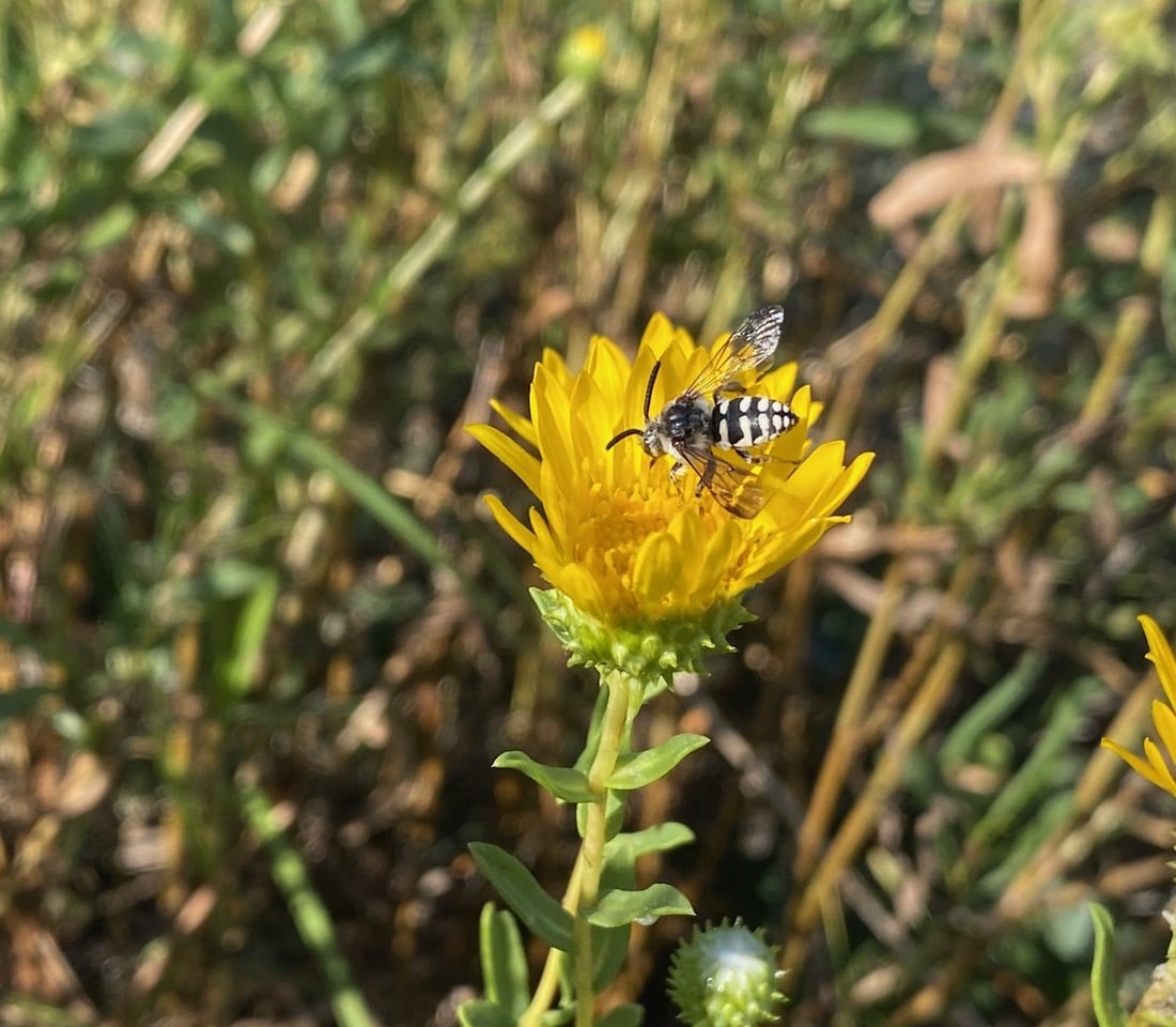 Hey, I recognize that abdomen with the thick broken white bands! It belongs to the California Digger-cuckoo Bee, Brachymelecta californica (family Apidae). The bee is taking nectar from a flowerhead of Oregon Gumweed, Grindelia stricta at Shoreline Park, Bay Farm Island.