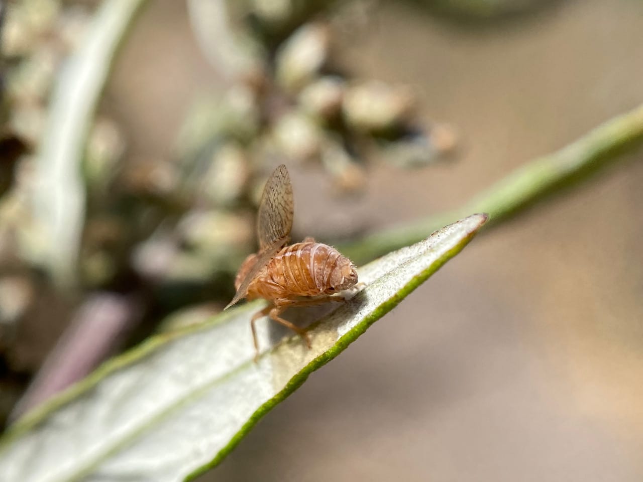 A Planthopper, Neaethus sp. (family Tropiduchidae) is staring at me with its strange googly eyes from a leaf of California Mugwort, Artemisia douglasiana.