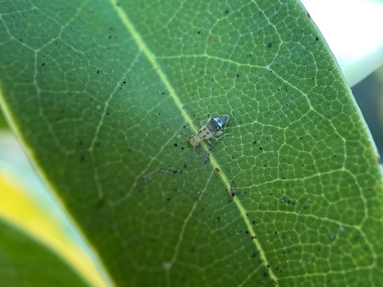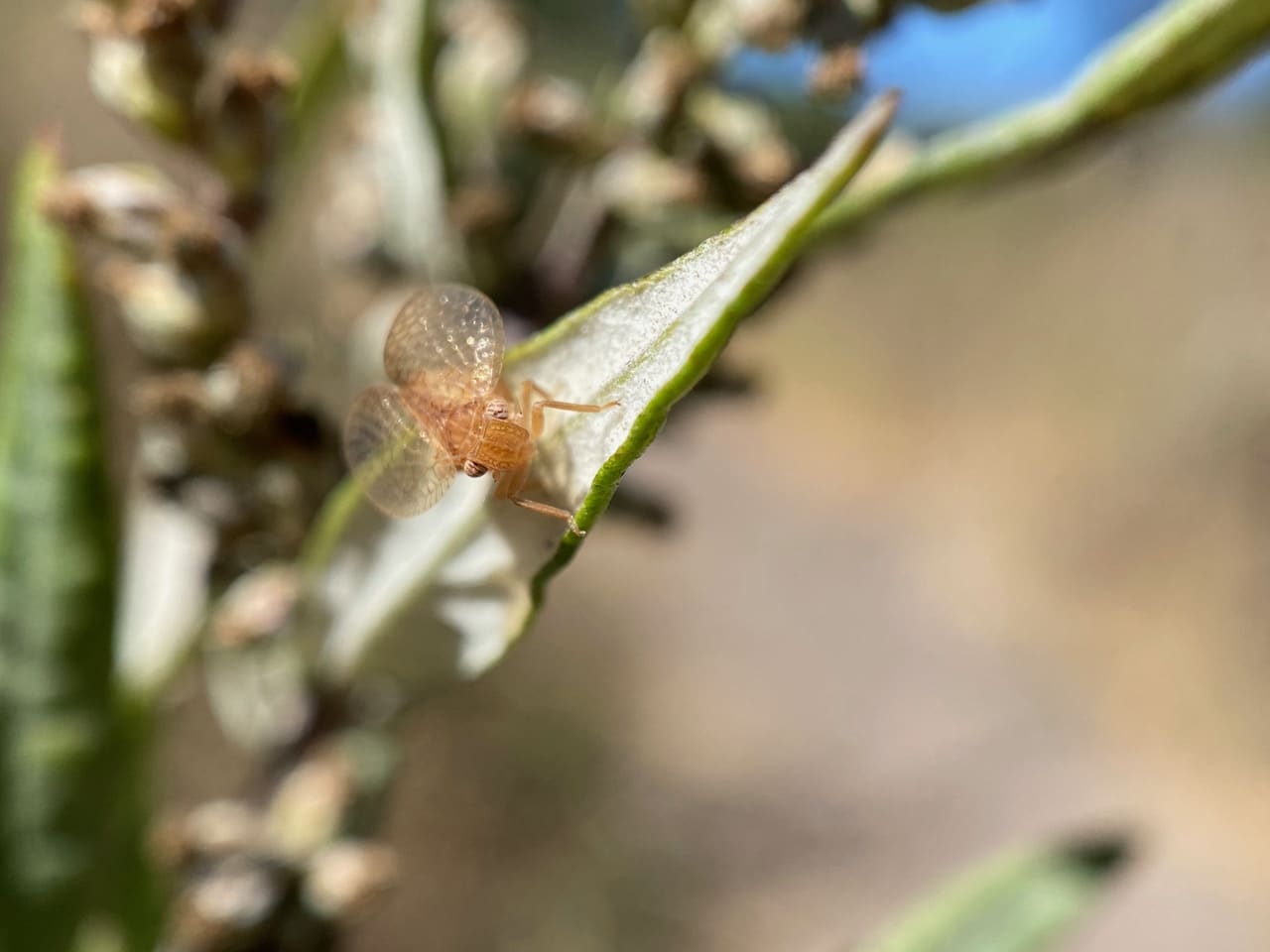 An F-winged Barklouse, is standing stock-still on a California Bay leaf. At certain angles of incident light, I can see strands of fine silk covering the leaf above the insect. Here the strands are visible in the top part of the photo.