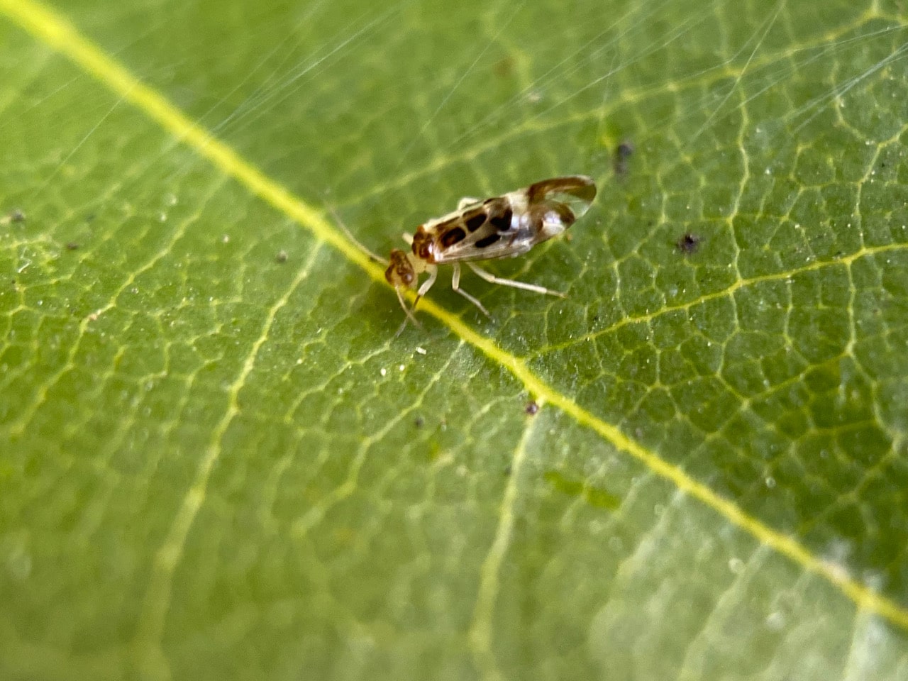 On a nearby leaf, a nymph can be seen faintly through a thin mesh of fine silk, but again only at certain angles of incident light.