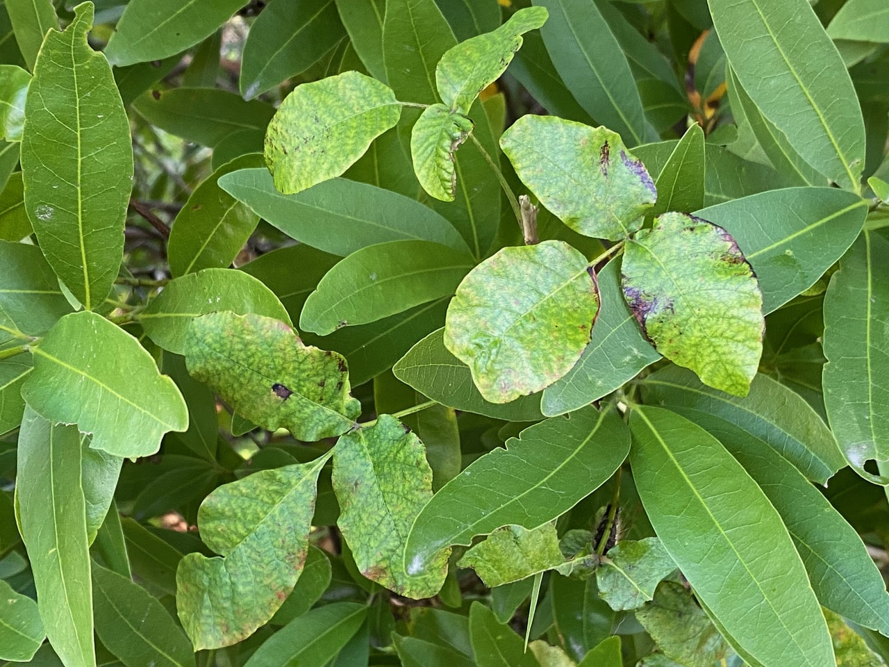 This is the Poison Oak that is growing among the lower foliage of a California Bay tree. The leaves are turning yellow and don’t look healthy. You can barely see the caterpillar on a base of a leaf on the lower right.