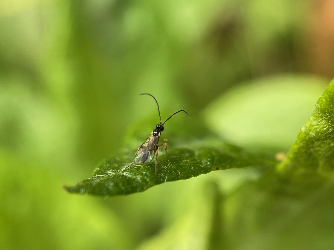 A tiny wasp lands on a Mugwort leaf, long antennae a-waving. For a wasp this size, I immediately suspect a parasitoid wasp, most likely in the superfamily Ichneumonoidea.