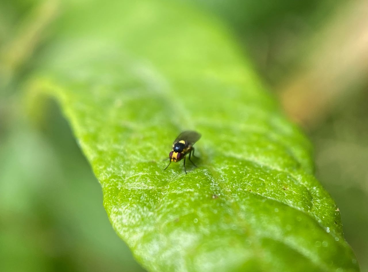 Whoa, that’s the biggest Lauxaniid fly I have ever seen! It’s probably a female ready to lay her eggs. These are some of the most numerous and widespread flies in the garden, but nobody ever talks about them; the fly does not even have a common name. Another one of those decomposers/recyclers, unsung heroes of the ecosystem.