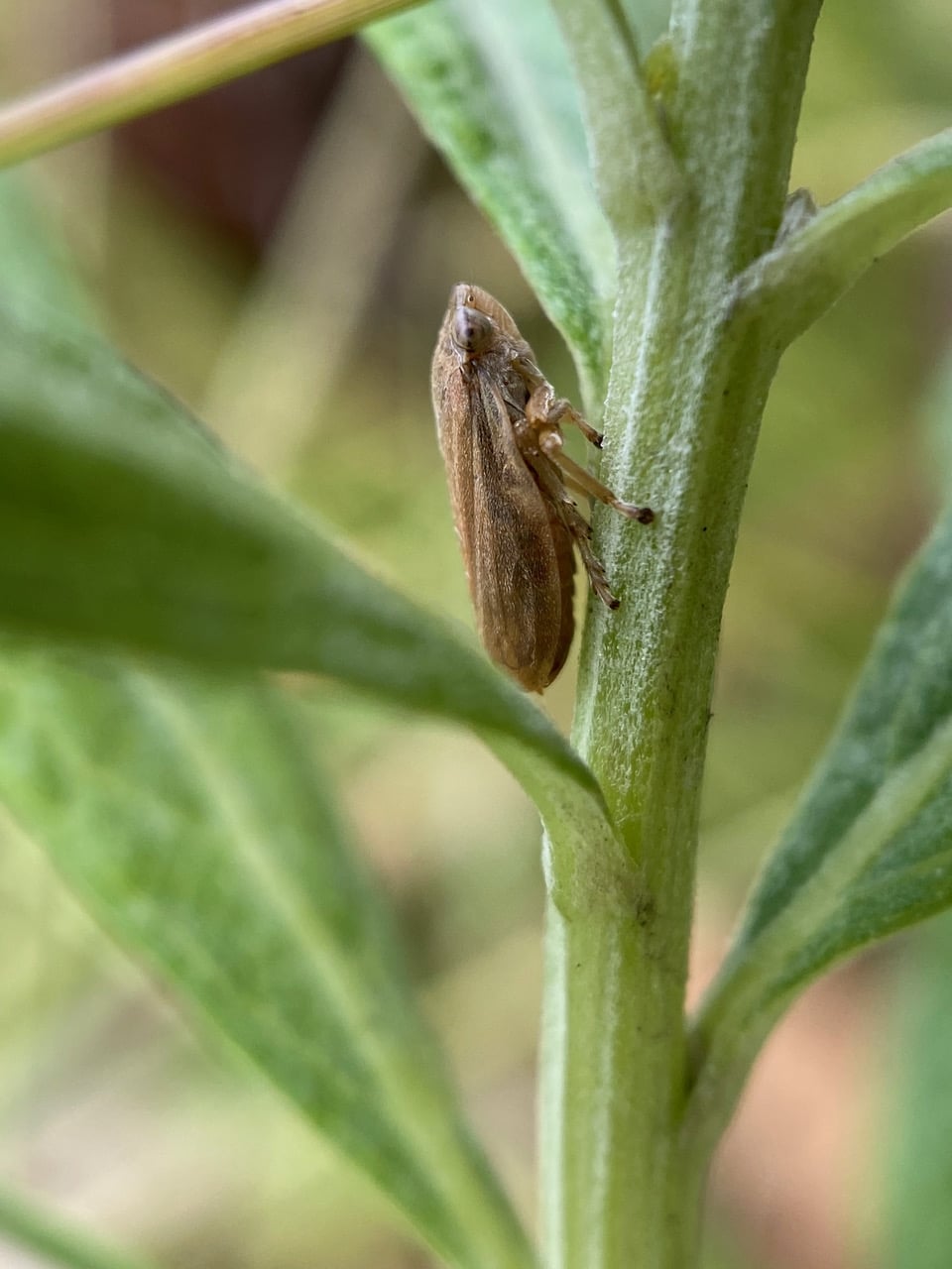 A Froghopper Philaenus sp.(family Aphrophoridae) is resting on the stem of a California Mugwort, Artemisia douglasiana. Most of the Froghoppers I have seen this year have been on Mugwort. I wonder if the plant is especially attractive to the bugs, or whether it is easier for me to spot them on the pale colored foliage?