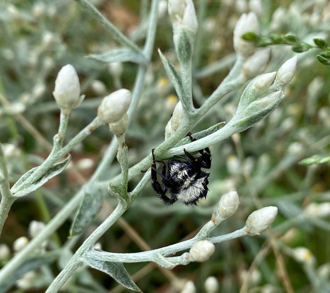 A wet and disheveled Yellow-faced Bumble Bee, Bombus vosnesenskii is perched motionless on a branch of the Fragrant Everlasting. It must have been caught unprepared in the heavy fog and never made it home last night. I wonder if it is still alive, but don’t have the heart to prod it to find out.