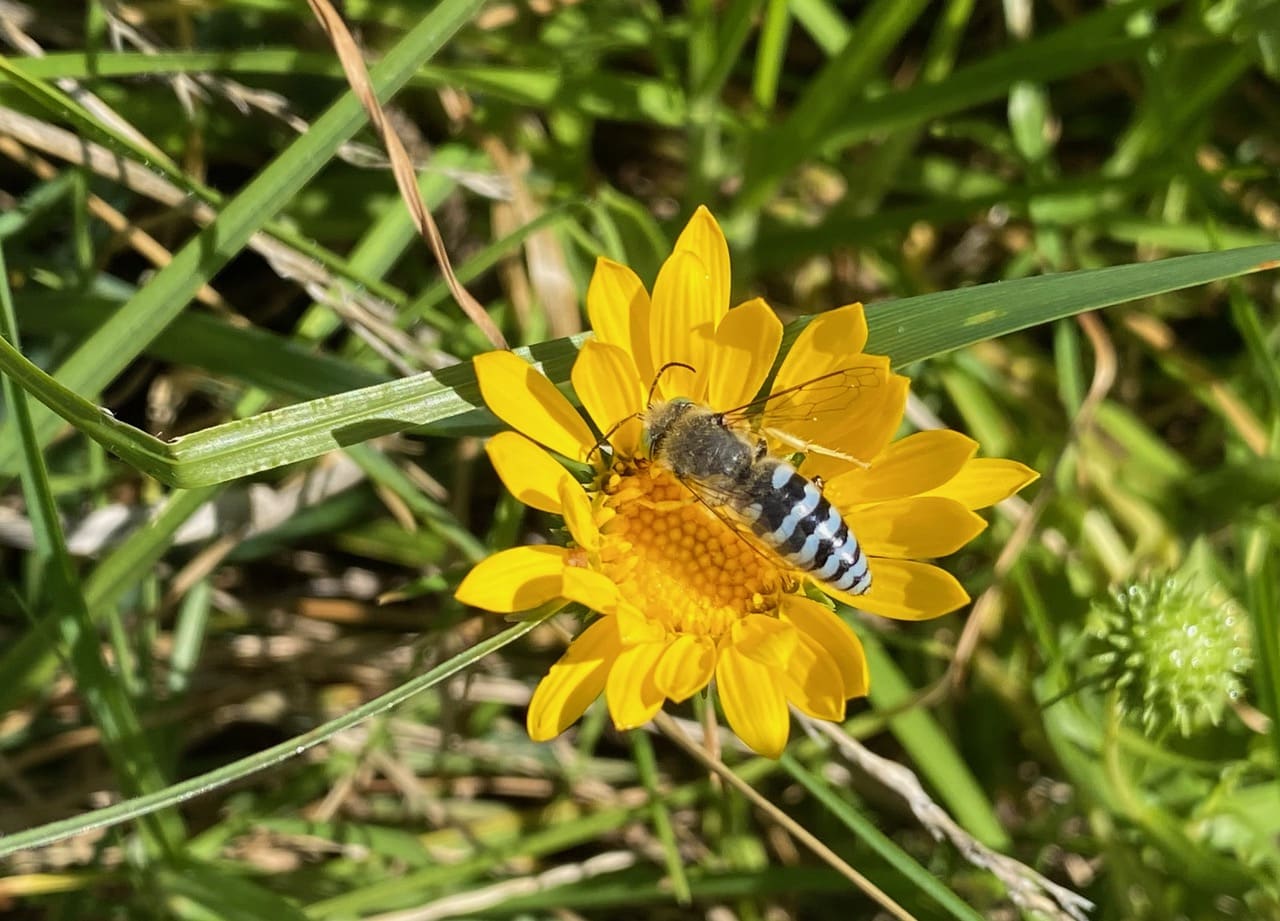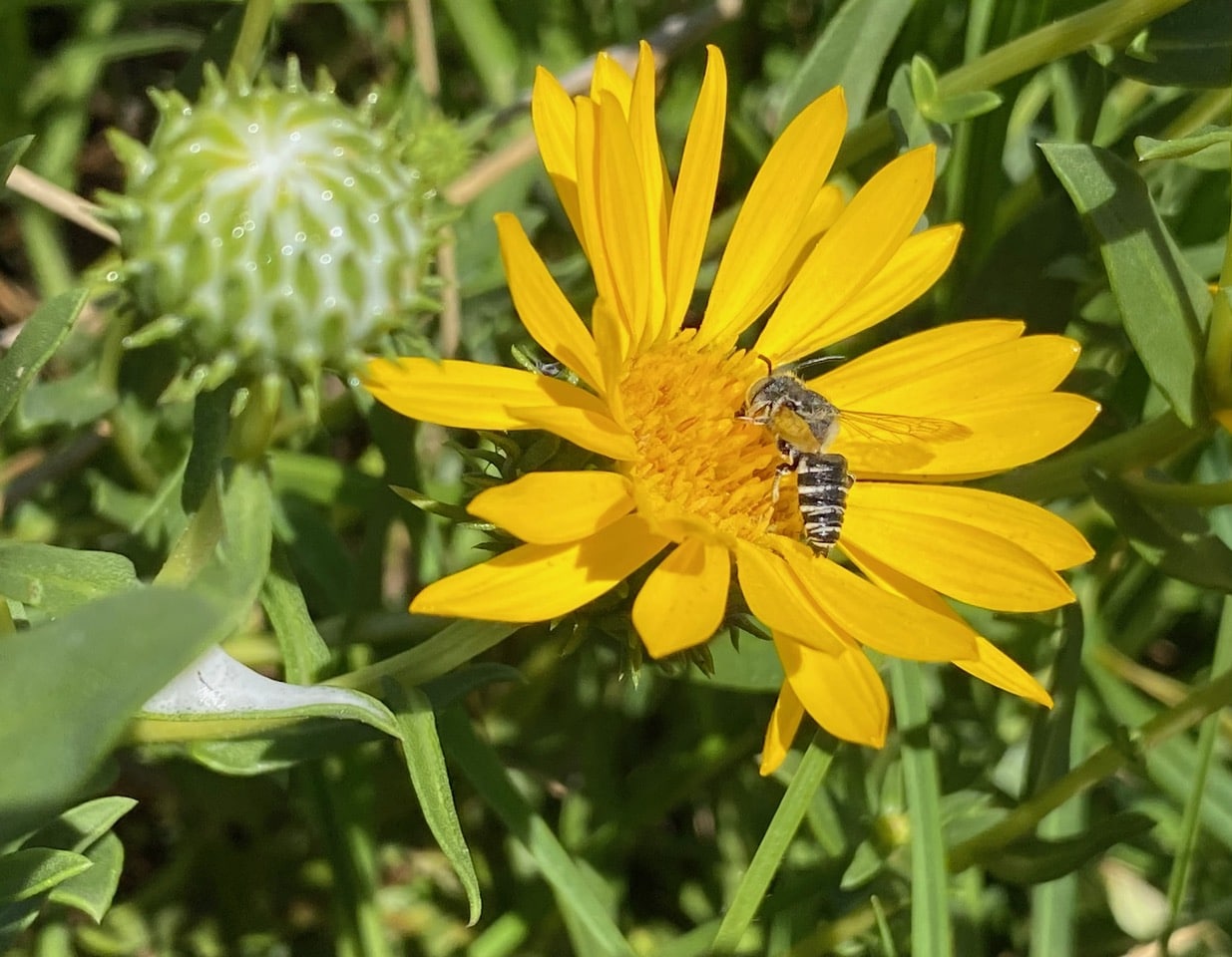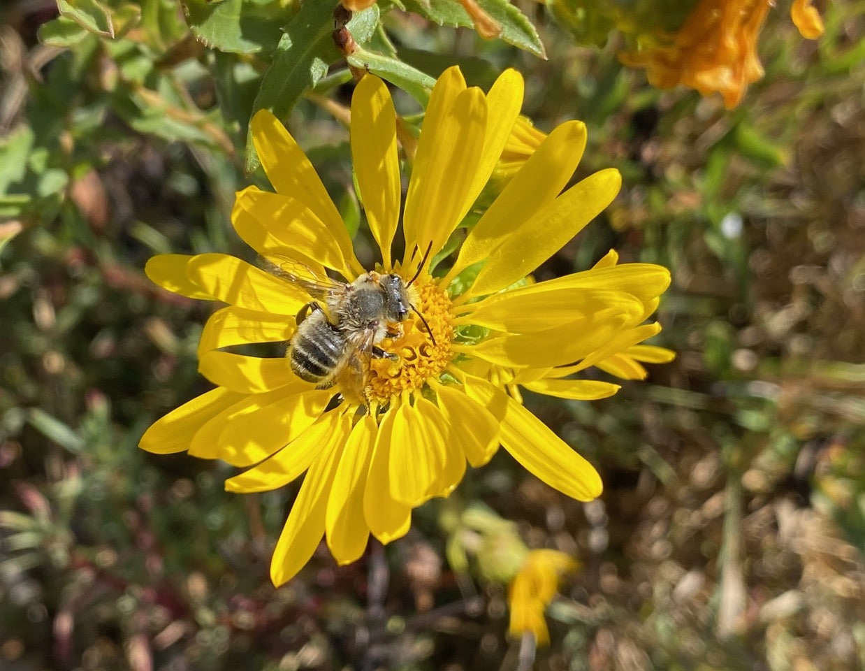 Hey, isn’t that a male Sharptail Bee on the Grindelia flowerhead? iNaturalist has identified the bee as the Red-footed Cuckoo Leafcutter, Coelioxys rufitarsis (family Megachilidae).