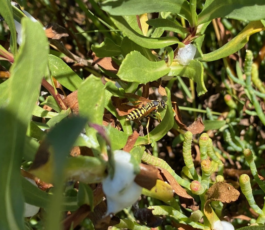 Numerous European Paper Wasps, Polistes dominula (family Vespidae) can be seen flying around the infested Grindelia, sometimes landing to investigate the foamy masses made by the Spittlebugs. Are the wasp hunting Spittlebugs or are they attracted by the honeydew produced by the sap-sucking bugs?