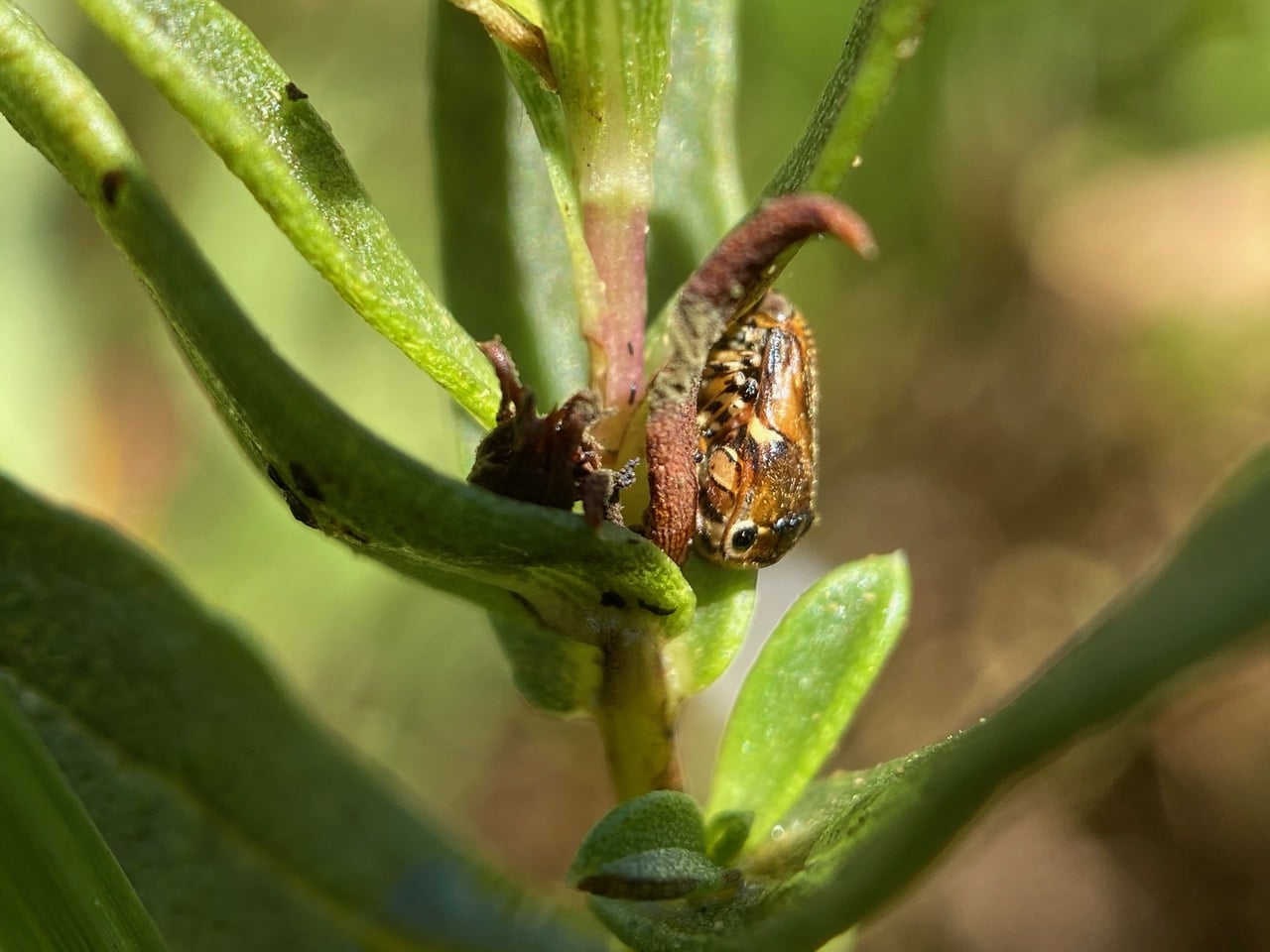 What on earth is that brown thing at the leaf axil. Is that an adult Spittlebug? Which side is up and which side is down?